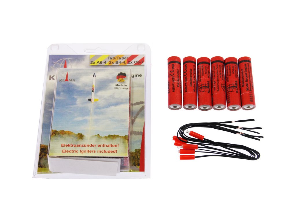 Obsahem balení jsou raketové motory: 2x A6-4, 2x B4-4, 2x C6-7, včetně zápalnic, návod k použití.