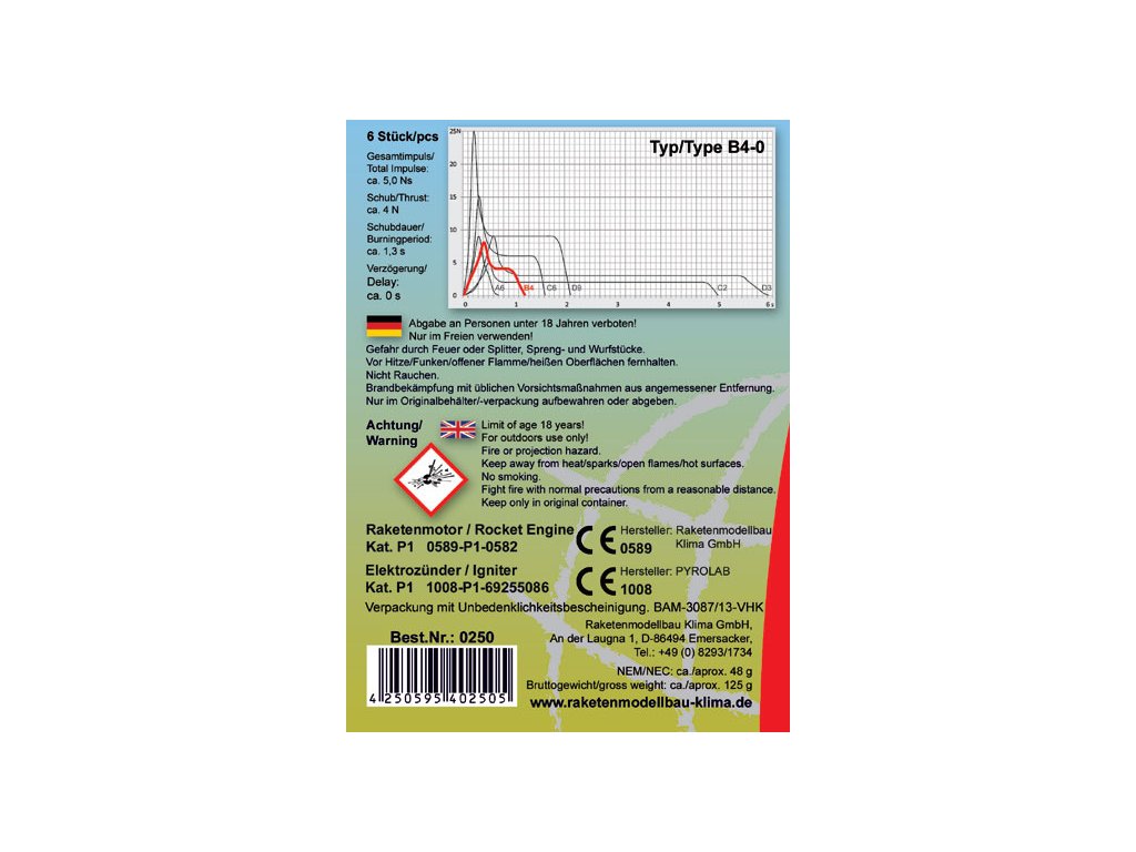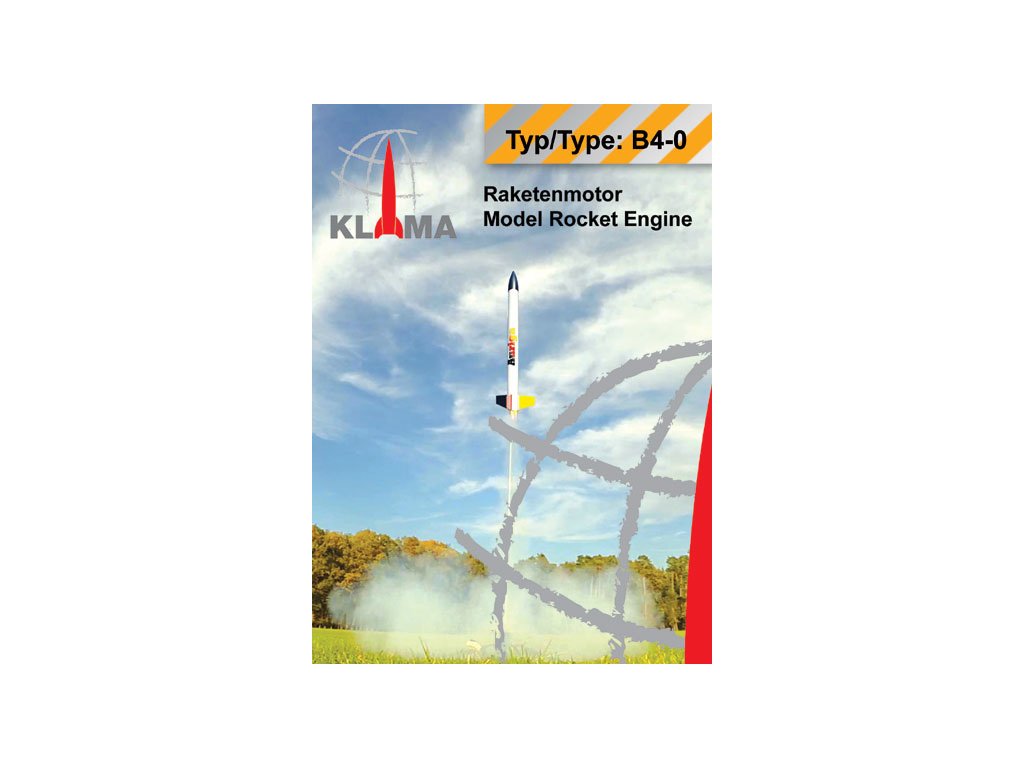 Raketový motor Klima B4-0 EL pro modely raket. Rozměr raketového motorku ø18 x 70 mm, impuls 5 N·s, průměrný tah E2 N, doba hoření 1.3 s, zpoždění výmetu 0 s. Hmotnost motorku 15.8 g, hmotnost náplně 5 g. Maximální doporučená hmotnost modelu rakety je 90 g.
