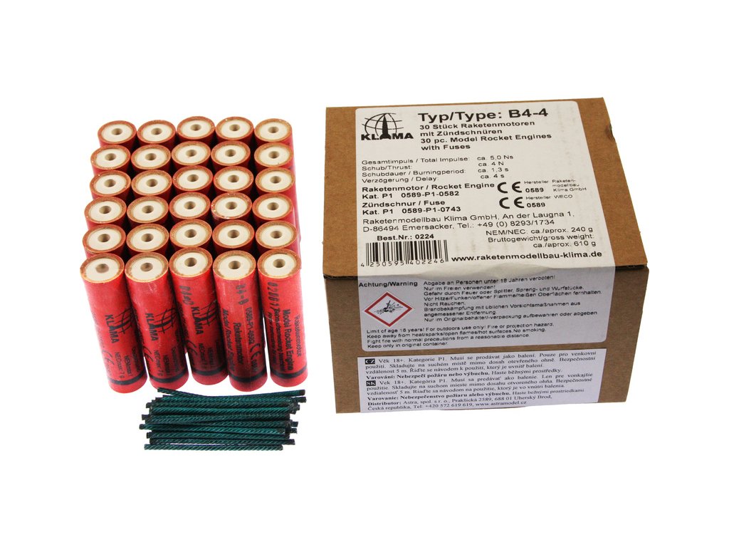 Raketový motor Klima B4-4 pro modely raket. Rozměr raketového motorku ø18 x 70 mm, impuls 5 N·s, průměrný tah E2 N, doba hoření 1.3 s, zpoždění výmetu 4 s. Hmotnost motorku 16.8 g, hmotnost náplně 5.8 g. Maximální doporučená hmotnost modelu rakety je 90 g.