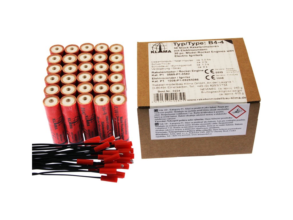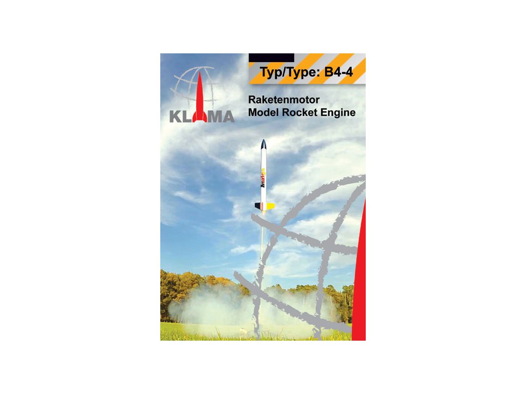 Raketový motor Klima B4-4 pro modely raket. Rozměr raketového motorku ø18 x 70 mm, impuls 5 N·s, průměrný tah E2 N, doba hoření 1.3 s, zpoždění výmetu 4 s. Hmotnost motorku 16.8 g, hmotnost náplně 5.8 g. Maximální doporučená hmotnost modelu rakety je 90 g.