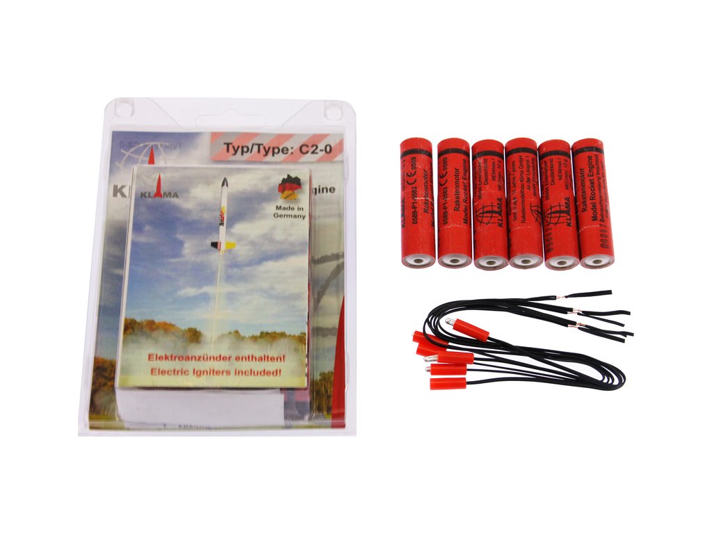 Raketový motor Klima C2-0 EL pro modely raket. Rozměr raketového motorku ø18 x 70 mm, impuls 10 N·s, průměrný tah E2 N, doba hoření 5 s, zpoždění výmetu 0 s. Hmotnost motorku 22.3 g, hmotnost náplně 11.5 g. Maximální doporučená hmotnost modelu rakety je 150 g.