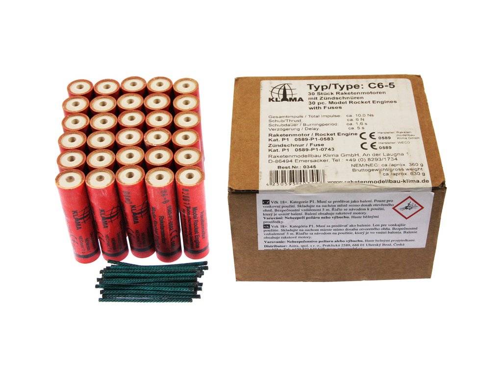 Raketový motor Klima C6-5 pro modely raket. Rozměr raketového motorku ø18 x 70 mm, impuls 10 N·s, průměrný tah E2 N, doba hoření 1.6 s, zpoždění výmetu 5 s. Hmotnost motorku 21.2 g, hmotnost náplně 10.2 g. Maximální doporučená hmotnost modelu rakety je 150 g.