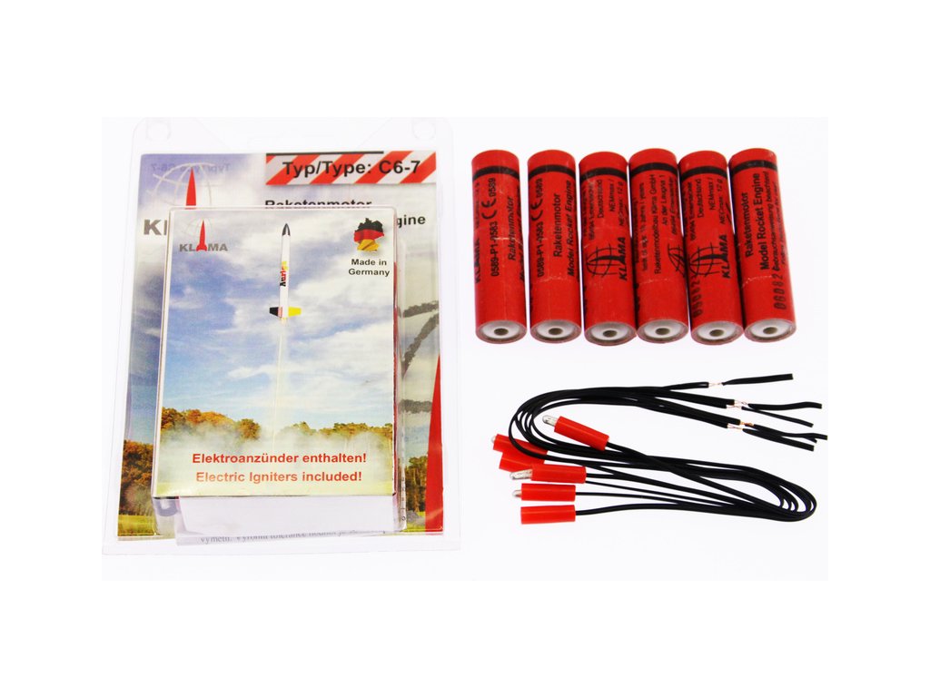 Obsahem balení je 6 ks raketových motorků Klima C6-7 včetně el. palníků, návod k použití.