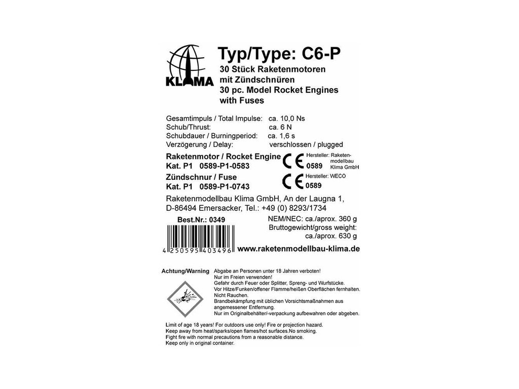 Raketový motor Klima C6-P pro modely raket. Rozměr raketového motorku ø18 x 70 mm, impuls 10 N·s, průměrný tah 6 N, doba hoření 1.6 s, bez výmetu. Hmotnost motorku 19.9 g, hmotnost náplně 8.4 g. Maximální doporučená hmotnost modelu rakety je 160 g.