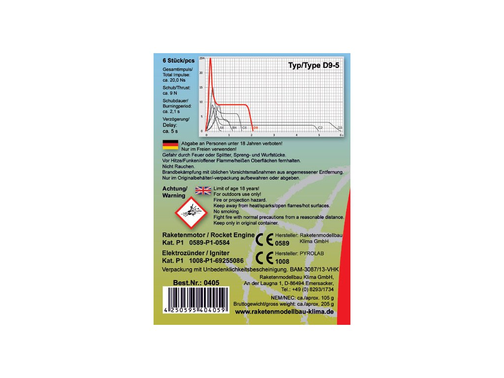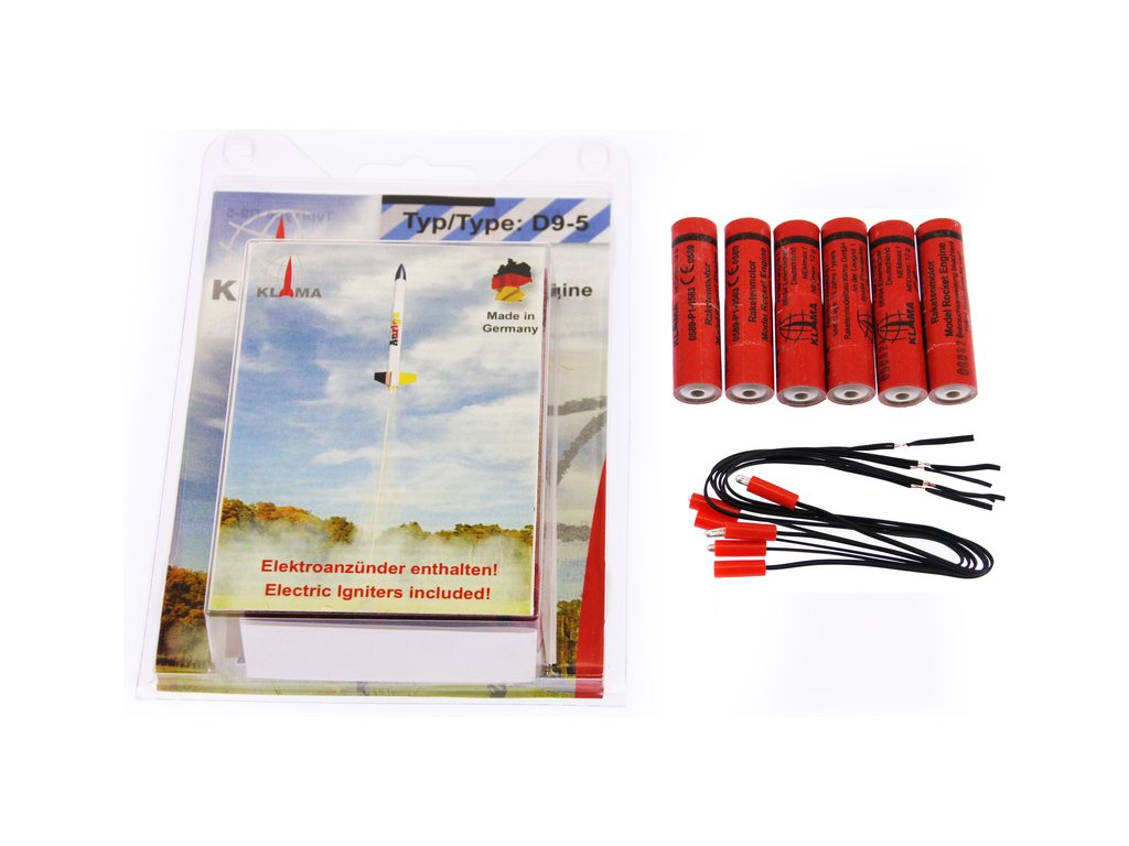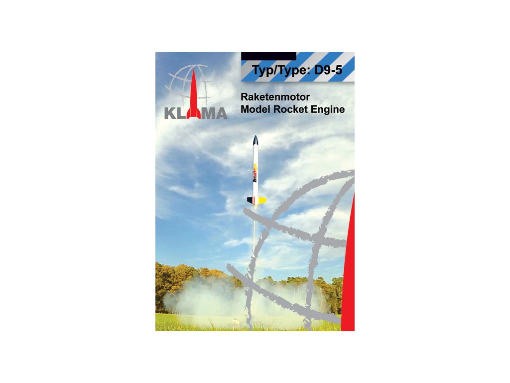 Raketový motor Klima D9-5 pro modely raket. Rozměr raketového motorku ø18 x 70 mm, impuls 20 N·s, průměrný tah E2 N, doba hoření 2.1 s, zpoždění výmetu 5 s. Hmotnost motorku 27.6 g, hmotnost náplně 16.6 g. Maximální doporučená hmotnost modelu rakety je 250 g.