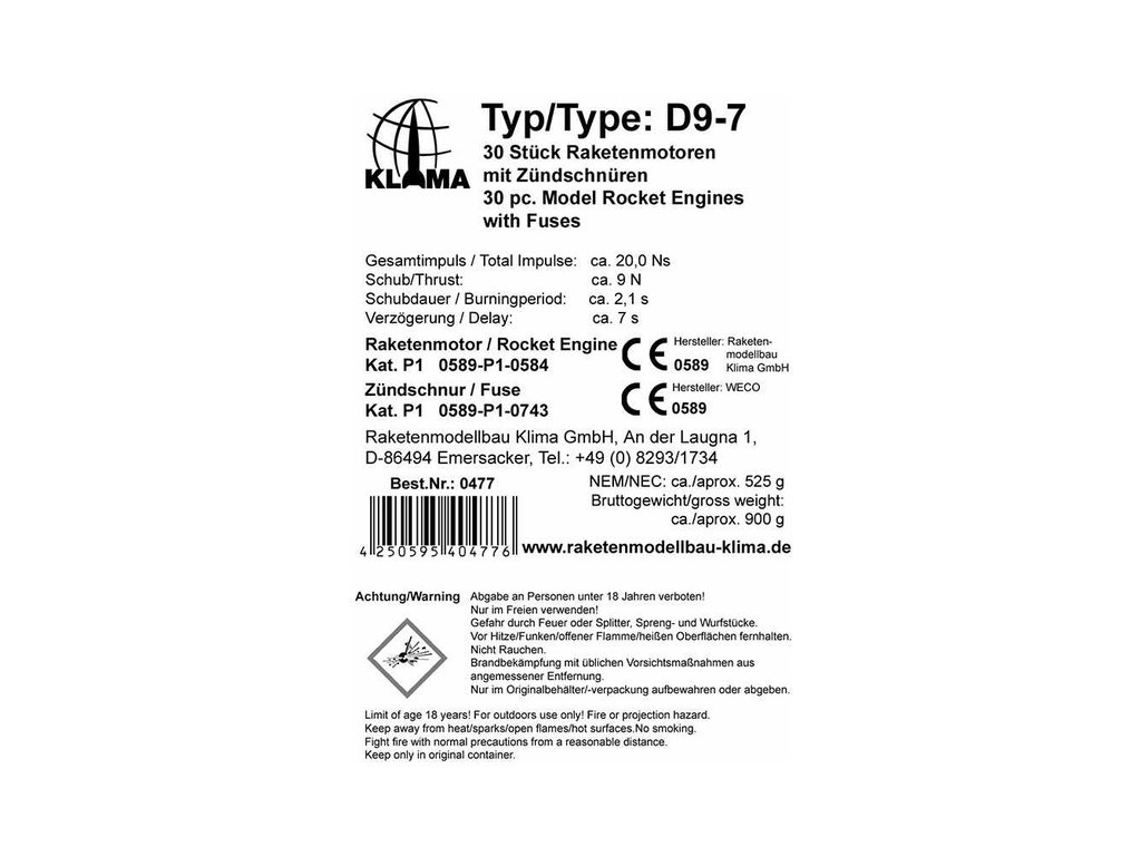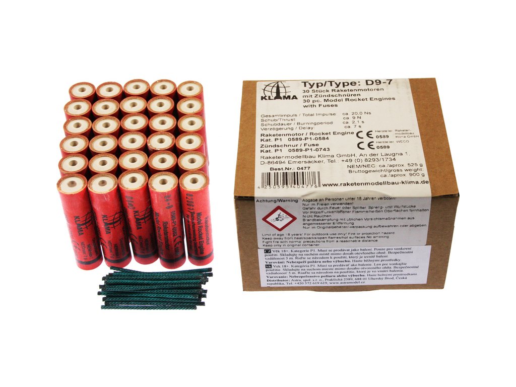 Raketový motor Klima D9-7 pro modely raket. Rozměr raketového motorku ø18 x 70 mm, impuls 20 N·s, průměrný tah 9 N, doba hoření 2.1 s, zpoždění výmetu 7 s. Hmotnost motorku 28.2 g, hmotnost náplně 17.2 g. Maximální doporučená hmotnost modelu rakety je 200 g.