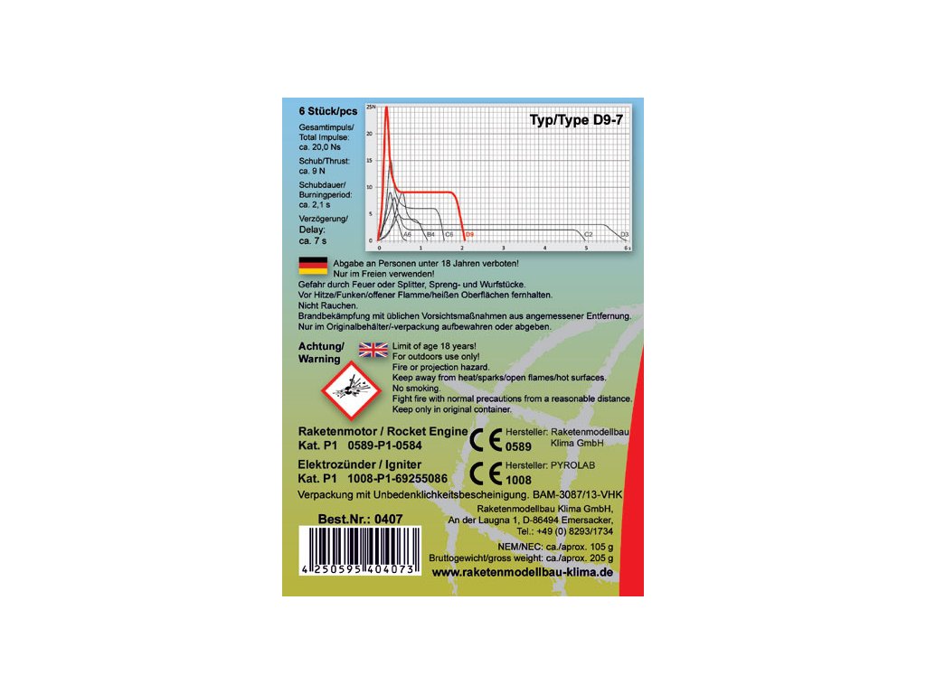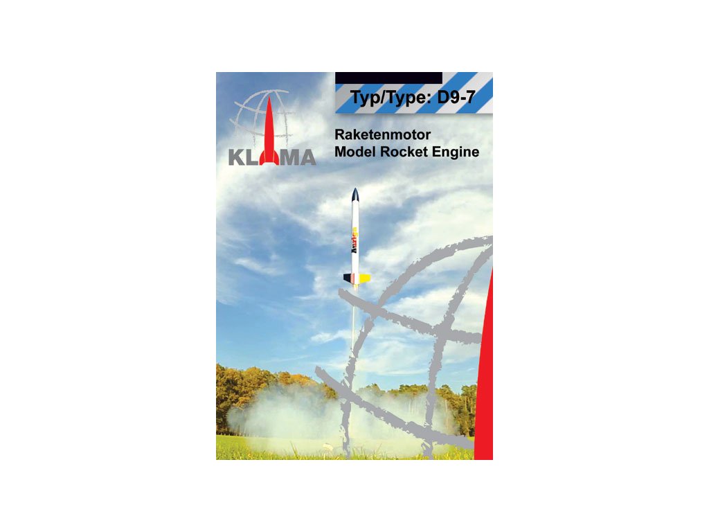 Raketový motor Klima D9-7 pro modely raket. Rozměr raketového motorku ø18 x 70 mm, impuls 20 N·s, průměrný tah E2 N, doba hoření 2.1 s, zpoždění výmetu 7 s. Hmotnost motorku 28.2 g, hmotnost náplně 17.2 g. Maximální doporučená hmotnost modelu rakety je 200 g.