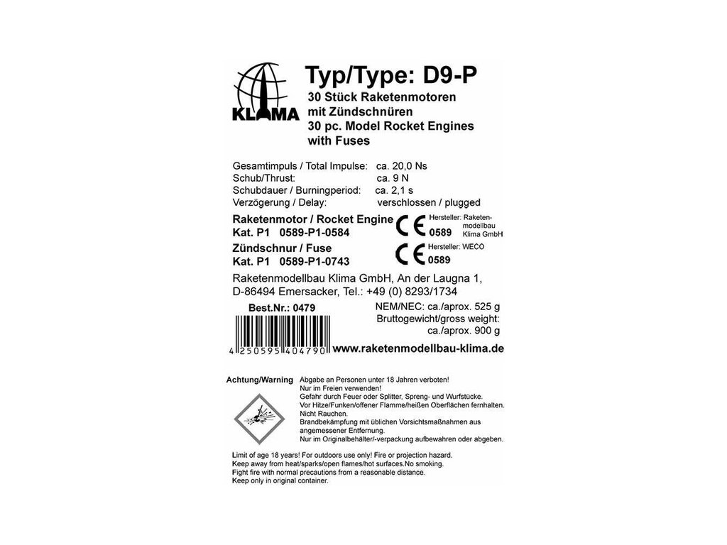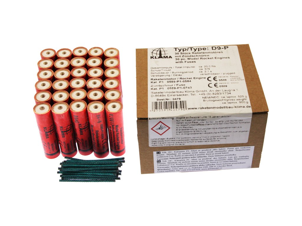 Raketový motor Klima D9-P pro modely raket. Rozměr raketového motorku ø18 x 70 mm, impuls 20 N·s, průměrný tah 9 N, doba hoření 2.1 s, bez výmetu s. Hmotnost motorku 28.5 g, hmotnost náplně 15 g. Maximální doporučená hmotnost modelu rakety je 300 g.