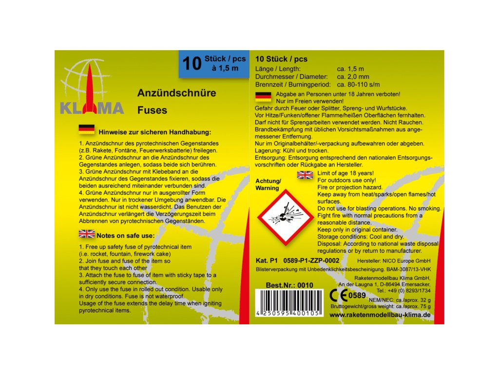 Klima zápalná šňůra délky 1.5 m s měrnou dobou hoření 80 - 110 s/m, slouží pro bezpečný zážeh raketového motoru. Průměr zápalné šňůry 2 mm. Balení obsahuje 10 ks. Pro osoby starší 18 let.