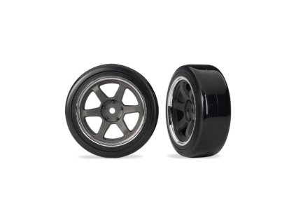 Náhradní díl pro RC modely aut Traxxas 4-Tec Drift Ford Mustang 1:10 RTR: kolo 1.9", grafitově šedý disk, pneu drift měkká zadní (2 ks)