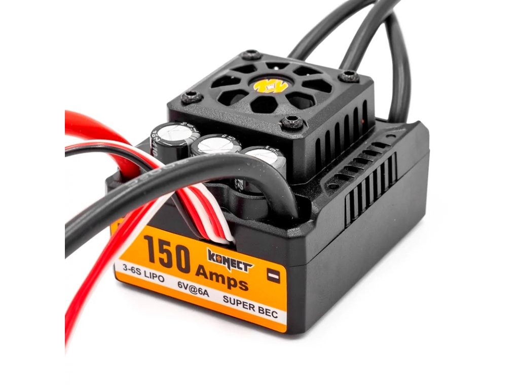 Regulátor s 150A trvalým zatížení je vodotěsný a má spínaný BEC, který poskytuje 6V s napájením 6A. To znamená, že bez problémů lze provozovat i Hi-Volt serva s vysokým točivým momentem a silným proudem.