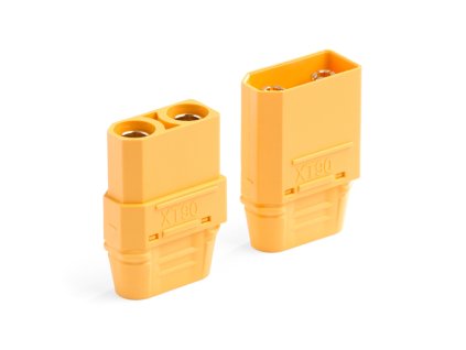 Dvoukolíkový silový konektor se zlacenými kontakty se zatížitelností max. 90 A. Pro kabely o průřezu max. 5,3 mm2 (10AWG). Přechodový odpor 0,30 mOhm, max. 500 V. Balení 1 pár.