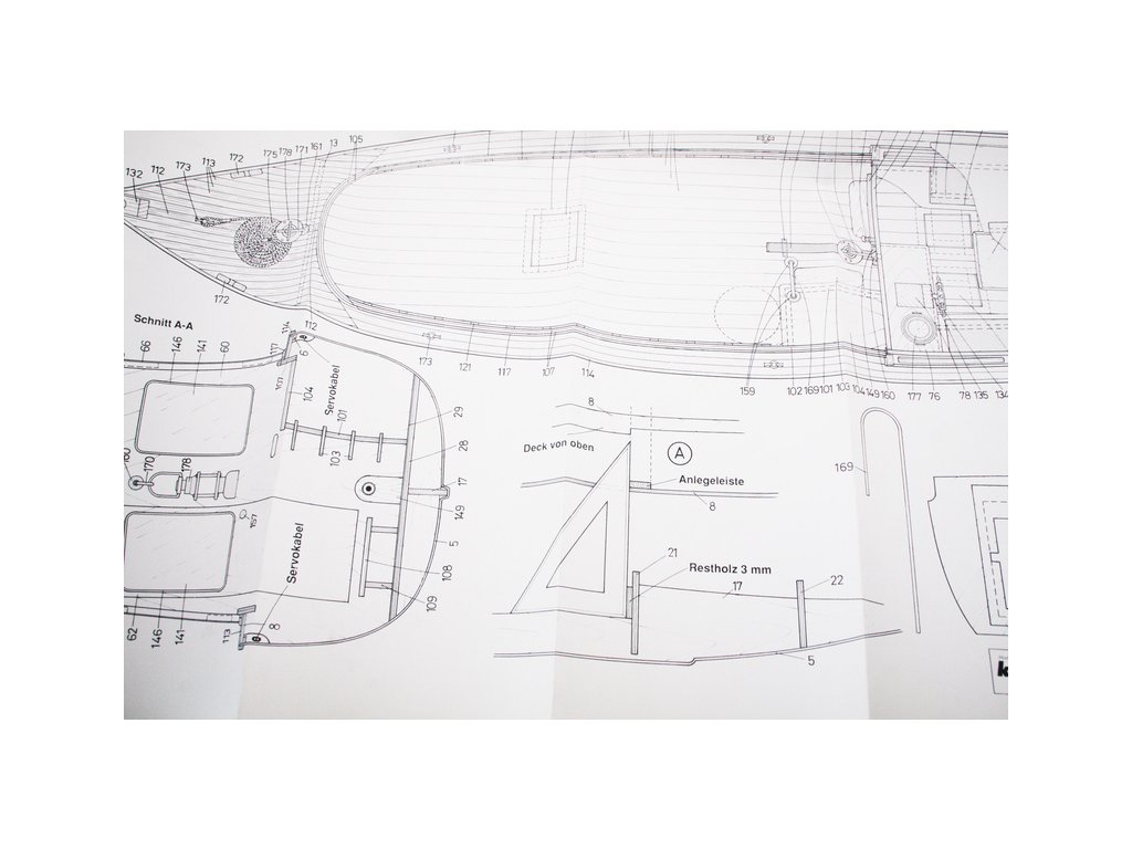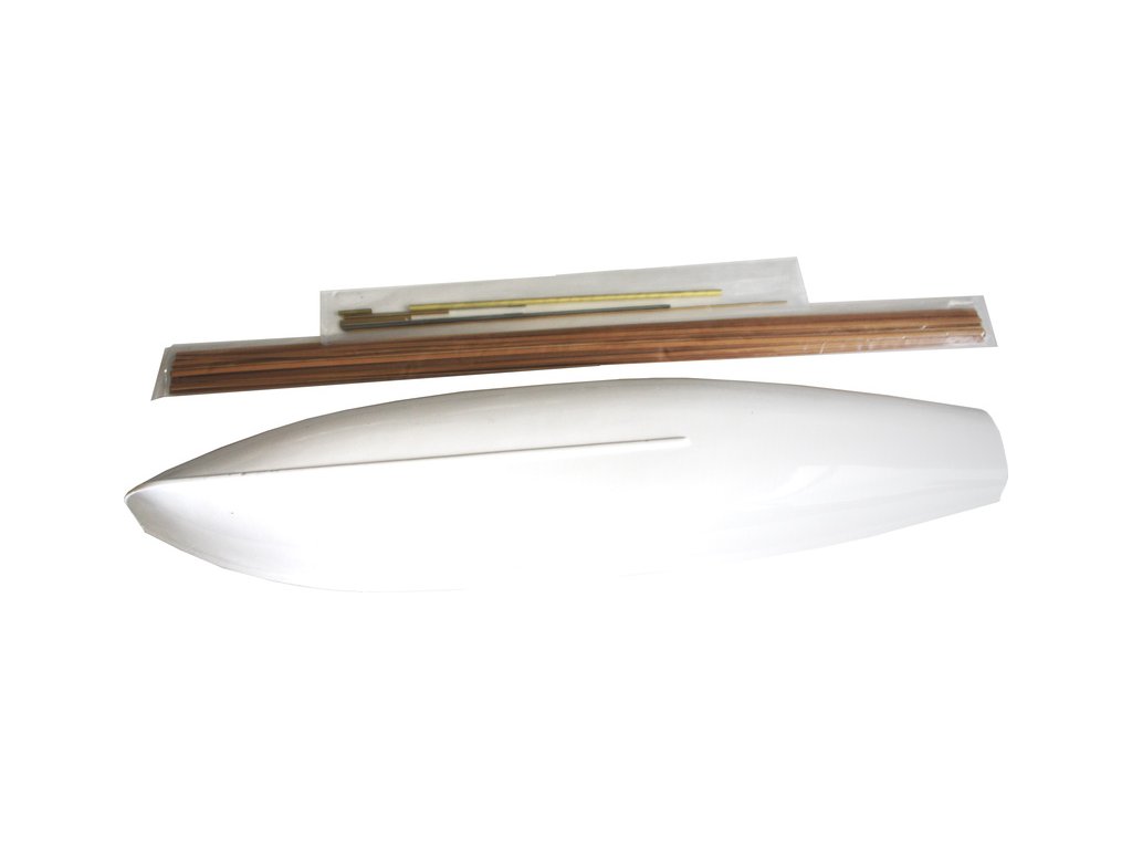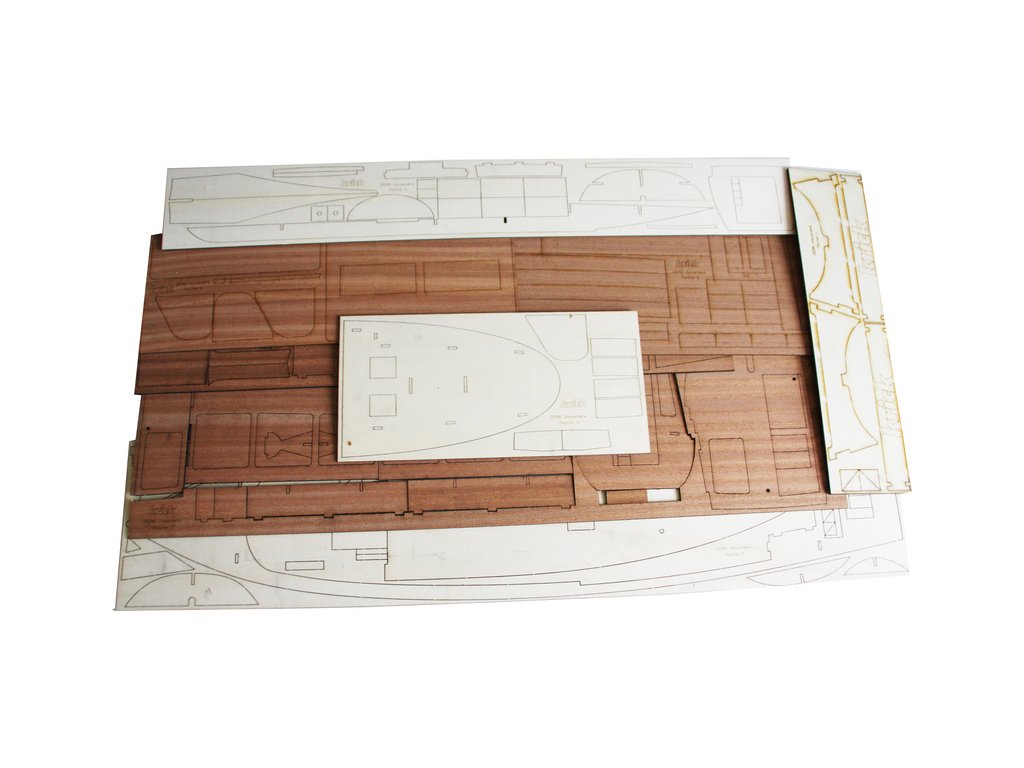 Po otevření víka krabice naleznete plastový ABS výlisek trupu, dřevěné díly modelu z překližky, sadu lišt, drobné součásti uzavřené v sáčcích, sadu výkresů a manuál.