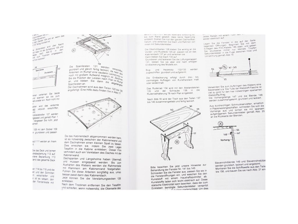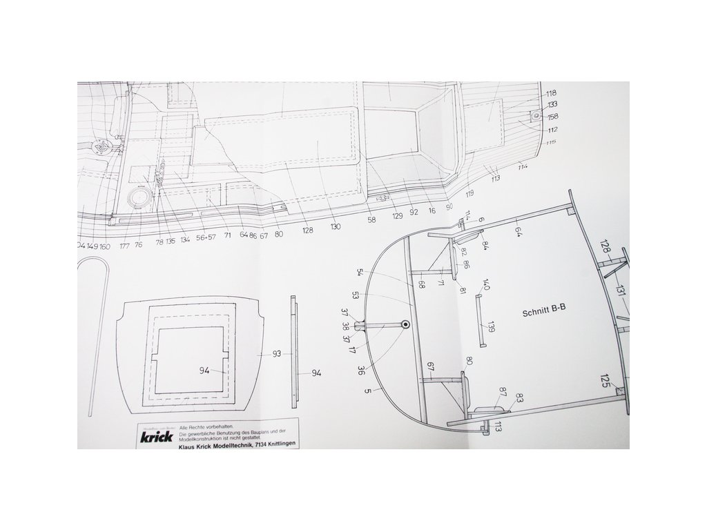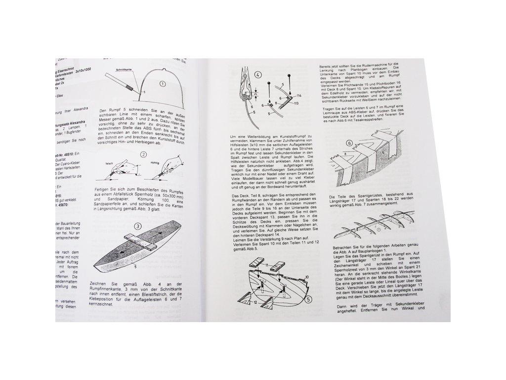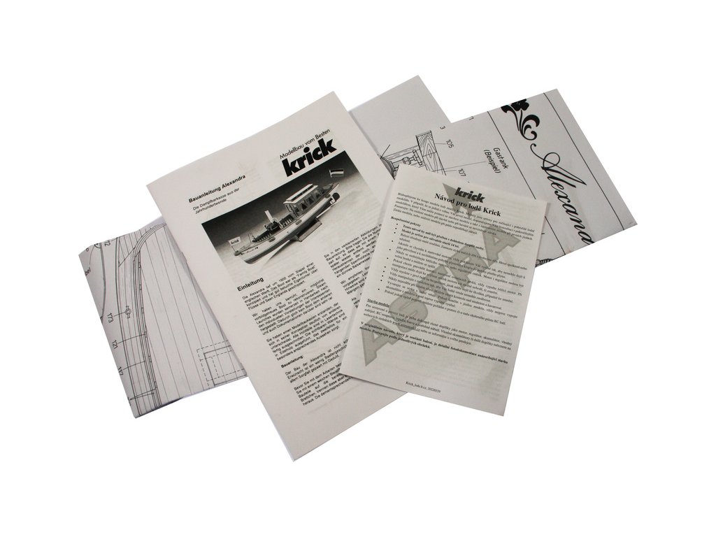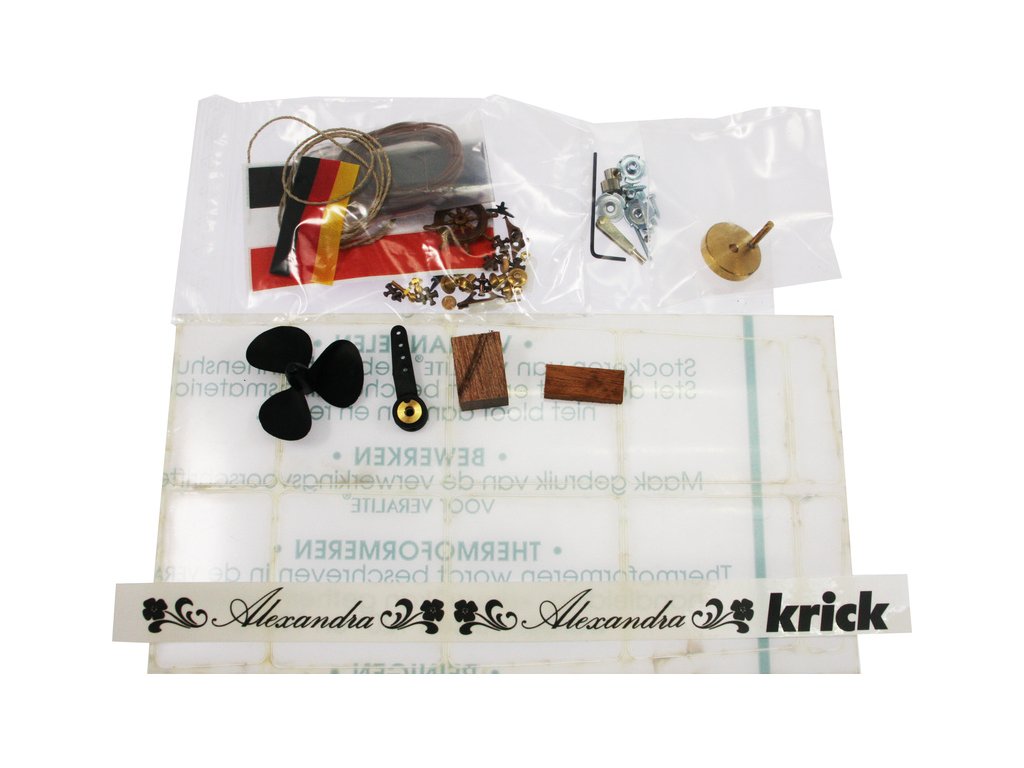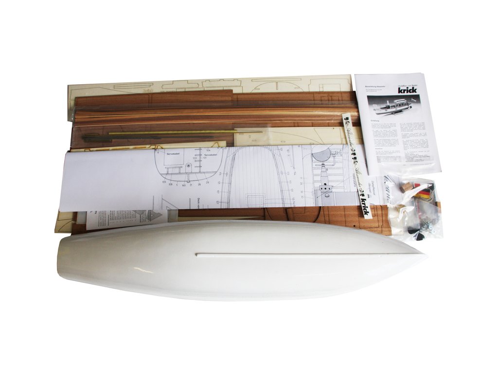 Stavebnice modelu lodi Krick Alexandra obsahuje plastový ABS výlisek trupu, dřevěné díly paluby, montážní součásti, německý manuál a pokyny k provozu.