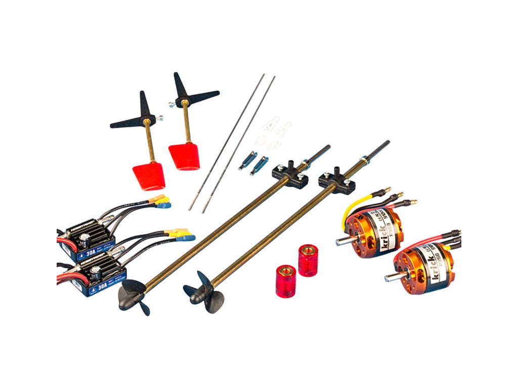 Duální střídavý pohon Krick Aquarama 1:10 pohonná sada se dvěma střídavými motory MAX Marine P-358, regulátory SEAKING 30A, náhony s protiběžnými lod. šrouby a spojkami, dvě kormidla a táhla. Určeno pro napájení LiPol 3S min. 3000mAh.