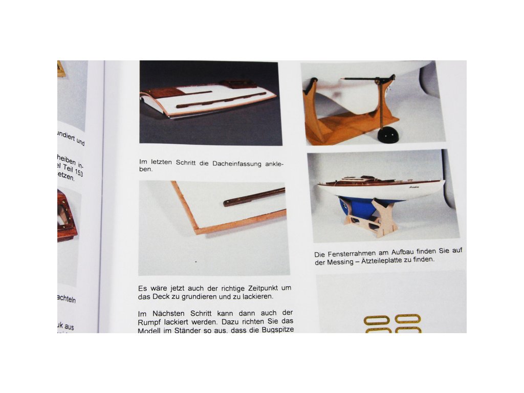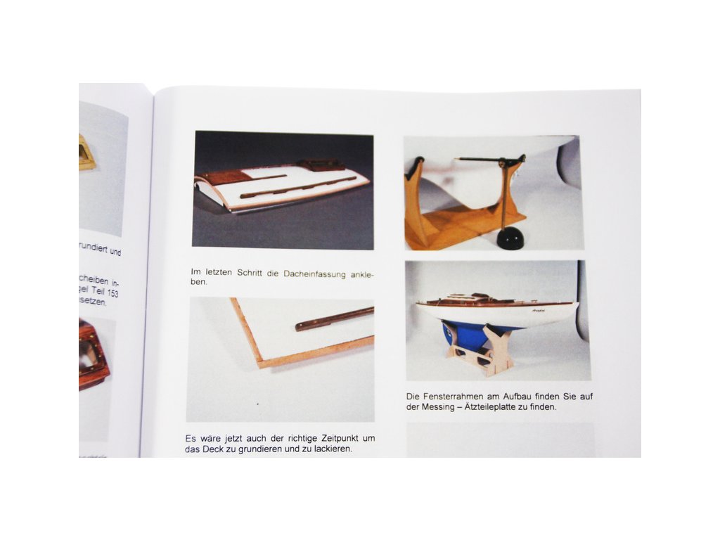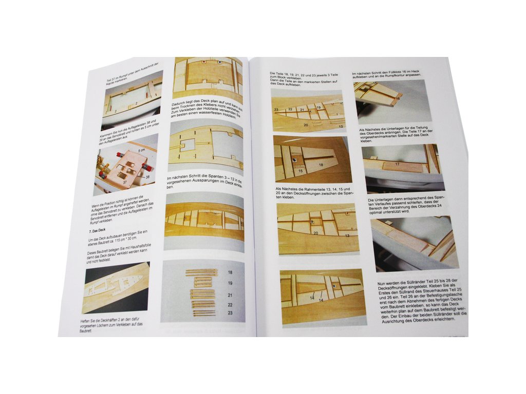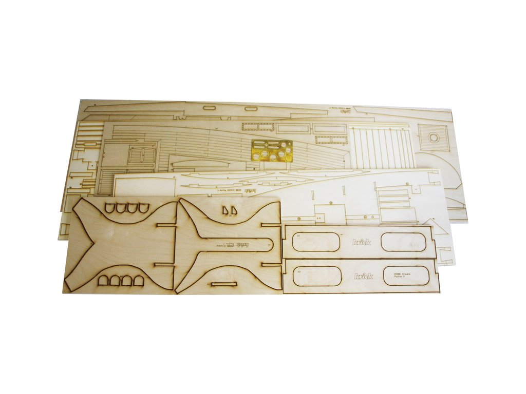Po otevření víka krabice naleznete laminátový trup, hliníkový stěžeň, plachty, dřevěné díly modelu z překližky, sadu lišt, drobné součásti, sadu výkresů a manuál.