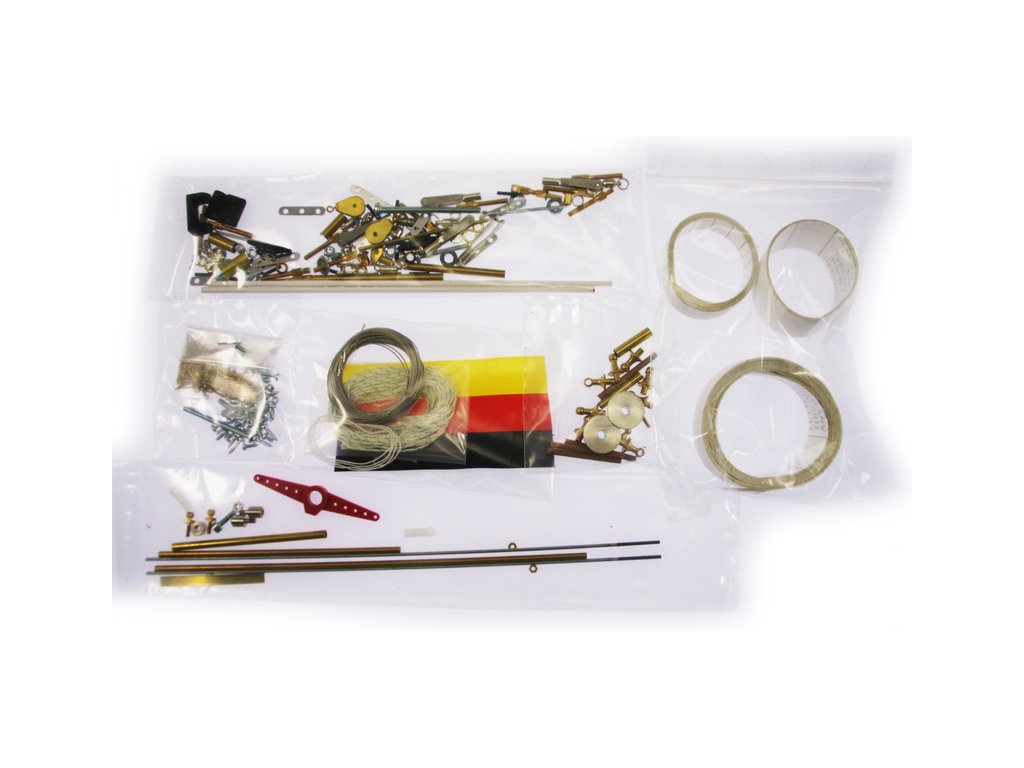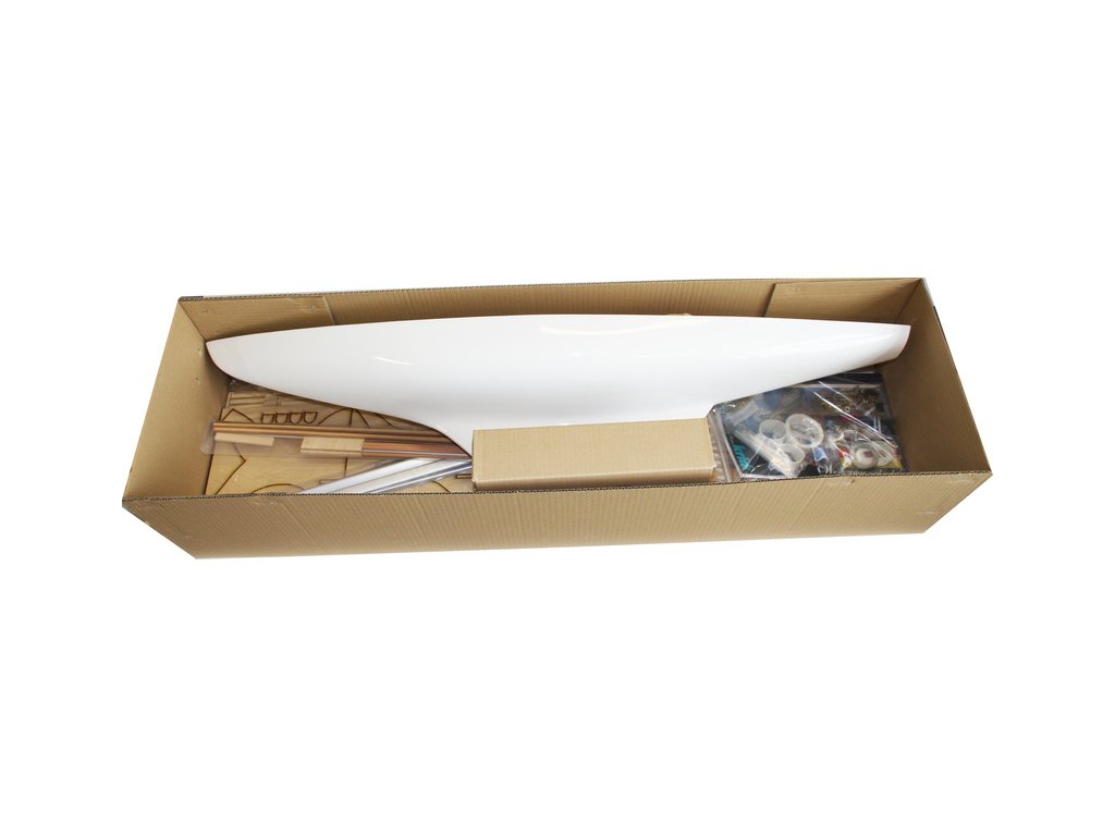 Balení obsahuje laminátový bíle nabarvený trup, hliníkový stěžeň, plachty, sadu překližkových dílů, sadu dřevěných lišt, sáčky s drobnými díly, díly z mosazi, sadu výkresů a vícejazyčný manuál.