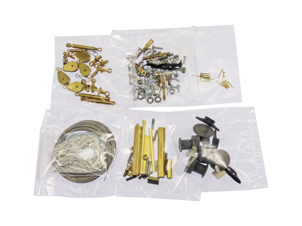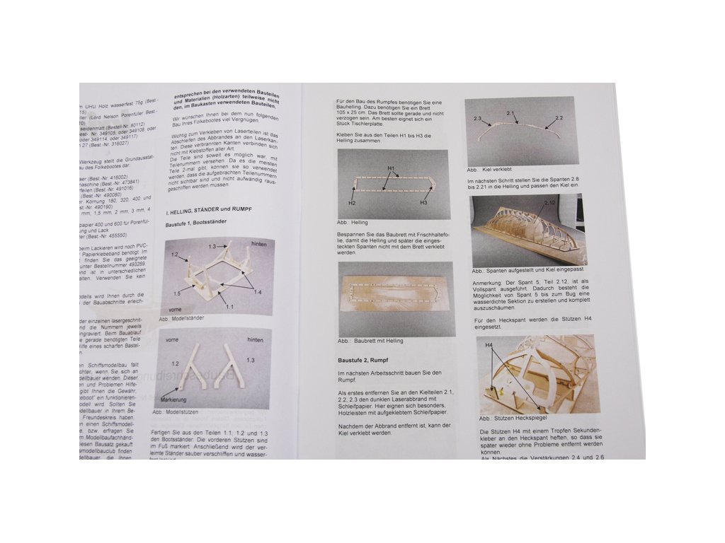 Po otevření víka krabice naleznete dřevěné díly modelu z překližky, drobné součásti uzavřené v sáčcích, plachty, maketové součásti, sadu výkresů a obrazový manuál.