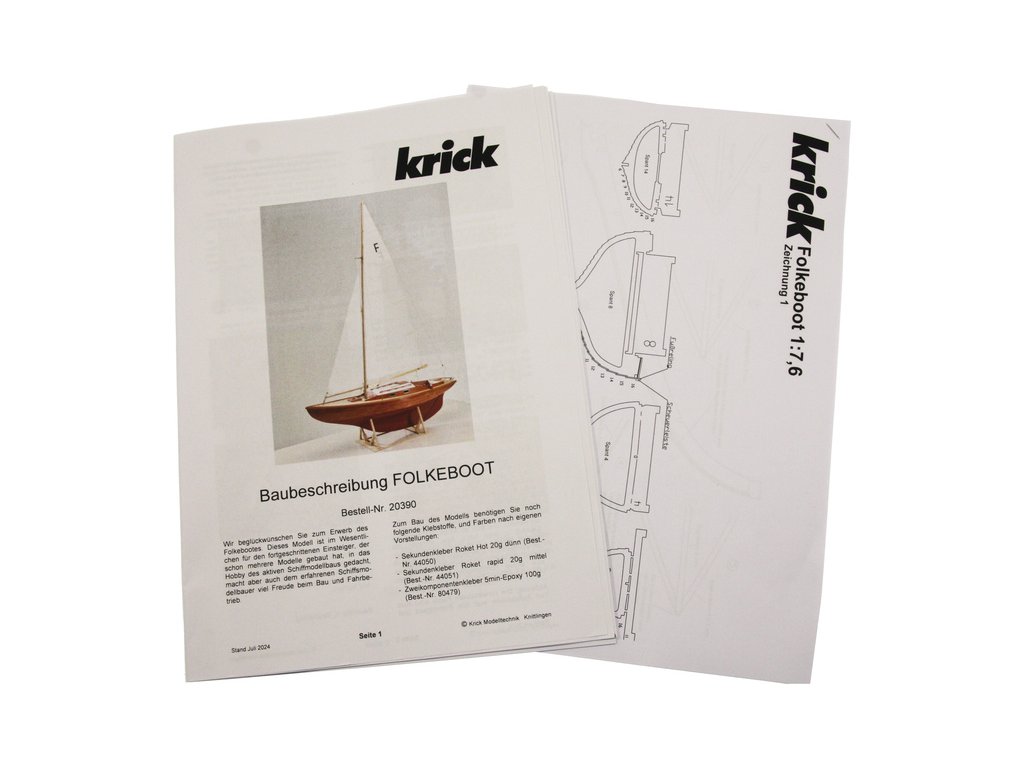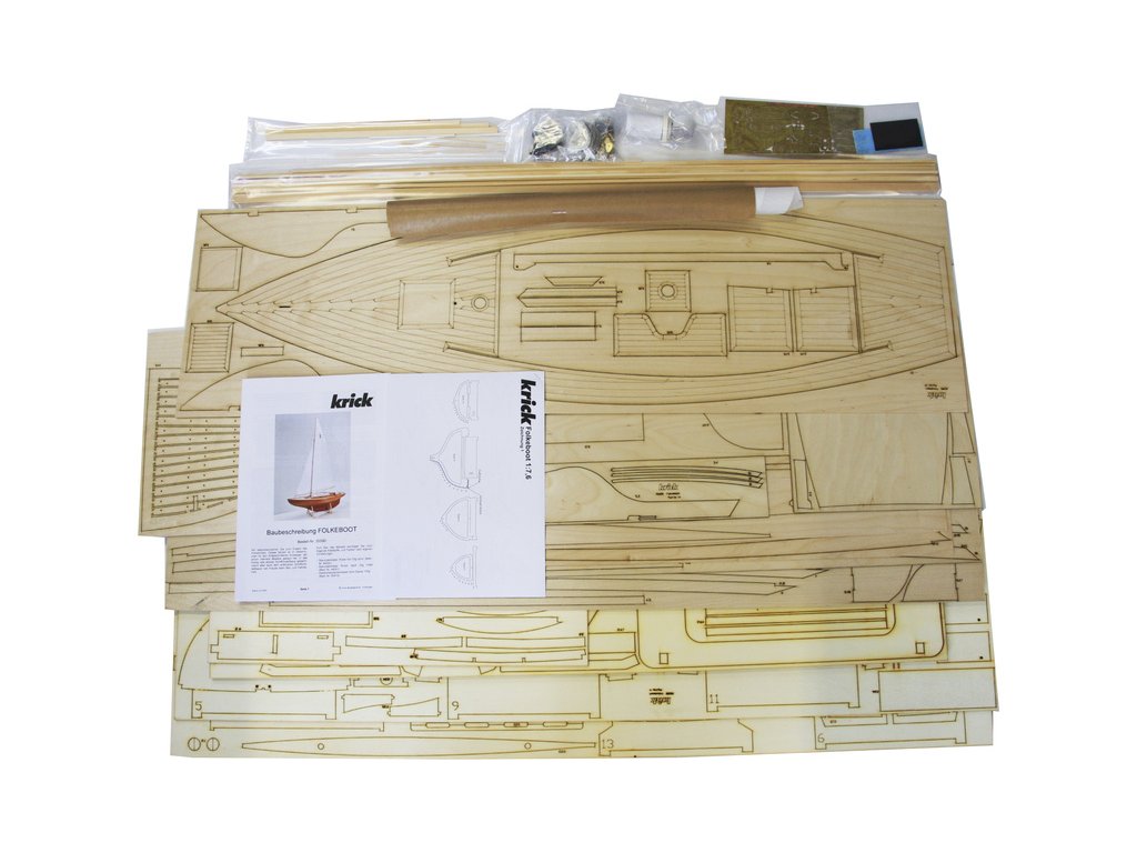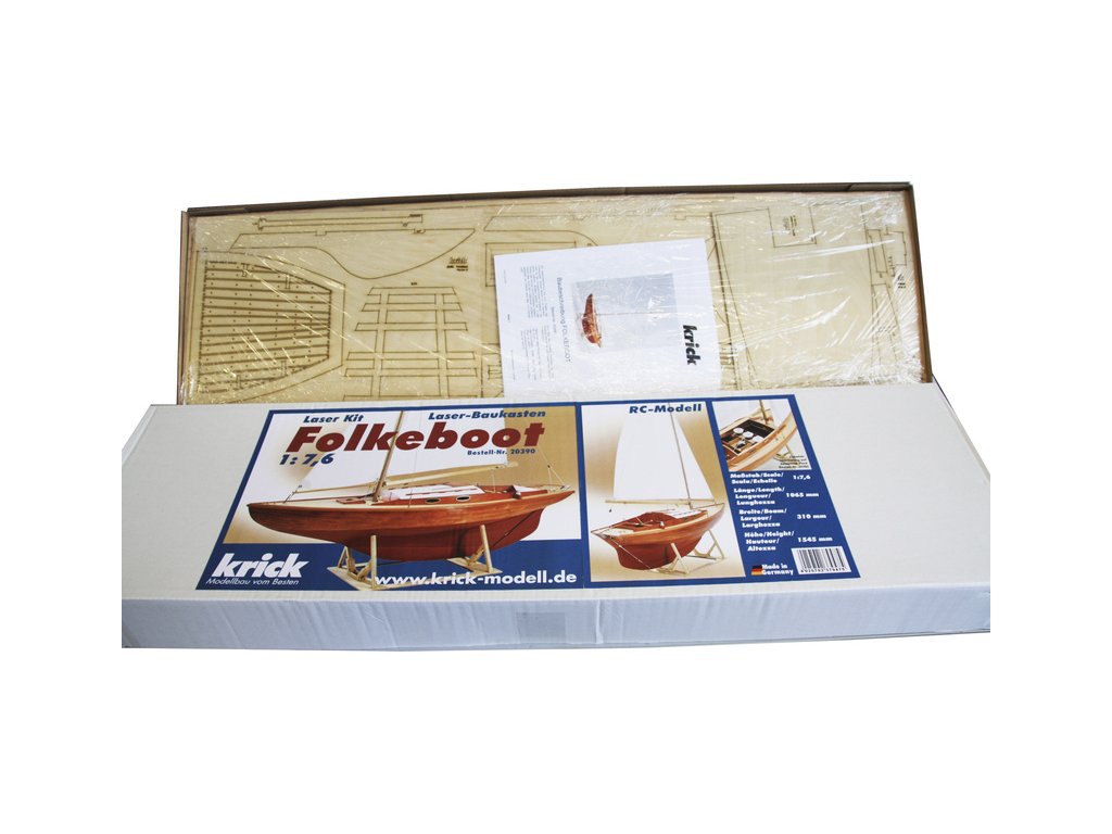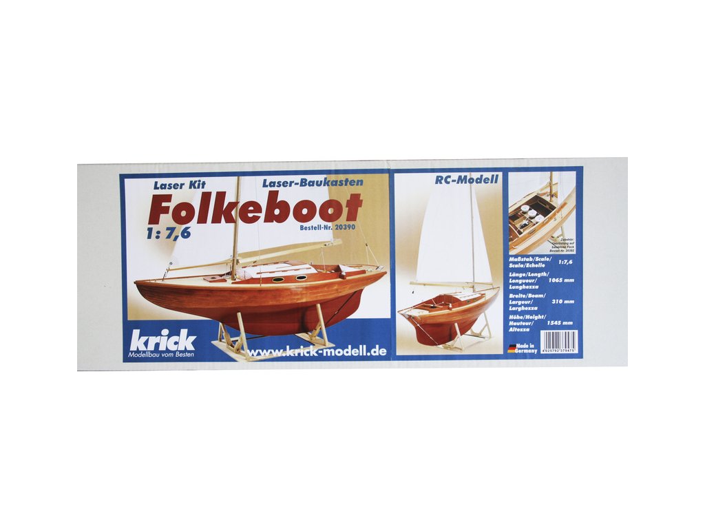 Krick Folkeboot 1:7.6 RC kit je stavebnice RC modelu lodi s celkovou délkou 106cm. Balení obsahuje laserem řezané dřevěné díly, kování, gravírovanou palubu pro stavbu lodi. Polotovar plachet je potřeba slepit a sešít. Zátěžový kýl (KR-20391) lze v případě že budete chtít loď jako funkční plachetnici, dokoupit jako volitelné příslušenství. Má integrované závitové tyče, které se vloží do dřevěného kýlu a přišroubují zevnitř.