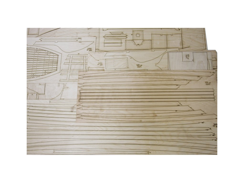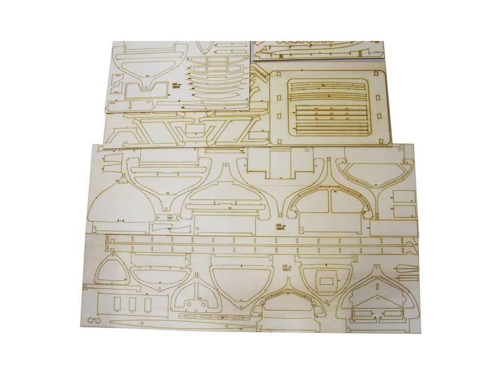 Balení obsahuje dřevění díly, kování, přegravírovanou palubu, materiál pro plachty, stěžeň. Manuál pro stavbu. Zátěžový kýl a elektronika nejsou obsahem balení.