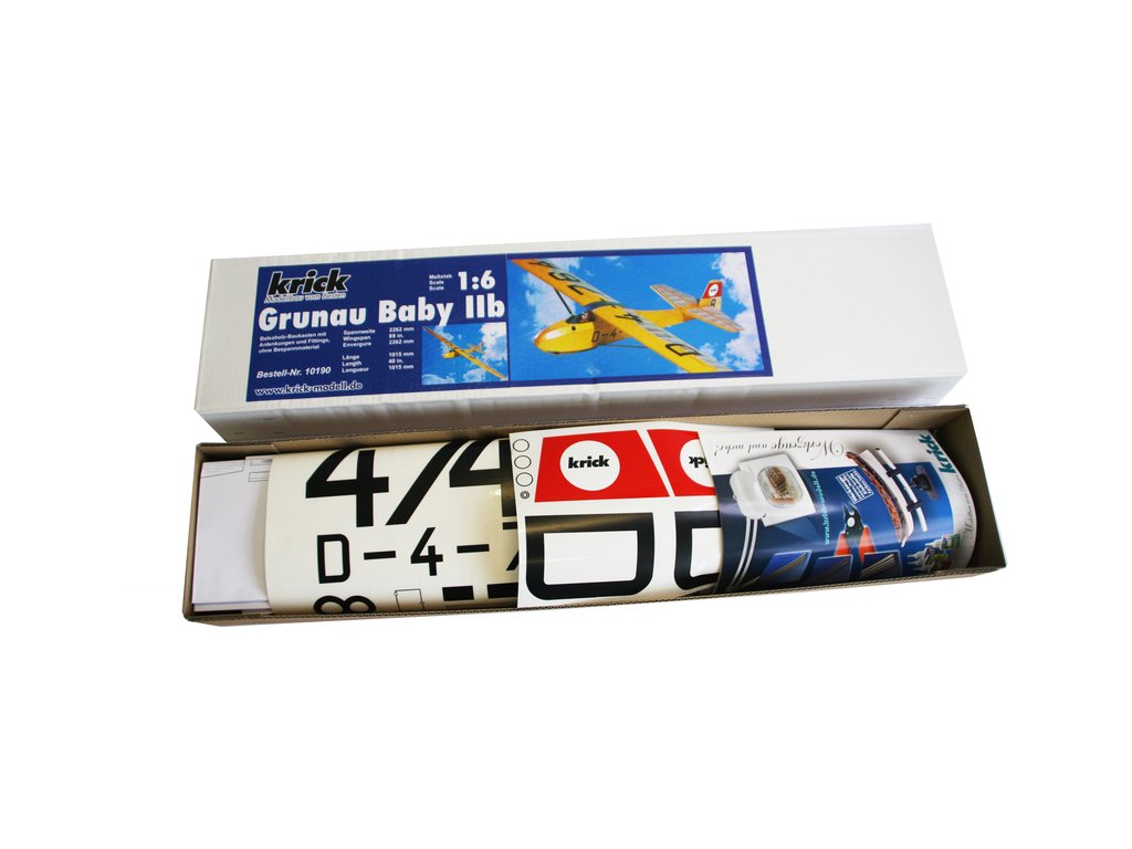 Stavebnice modelu známého německého větroně Grunau Baby v měřítku 1:6 Kit v rozsypu. Konstrukční celodřevěný model, laserem vyřezané díly z lehké překližky a balzy, kovové díly a příslušenství. Doporučena je modelářská praxe se stavbou dřevěných modelů letadel.