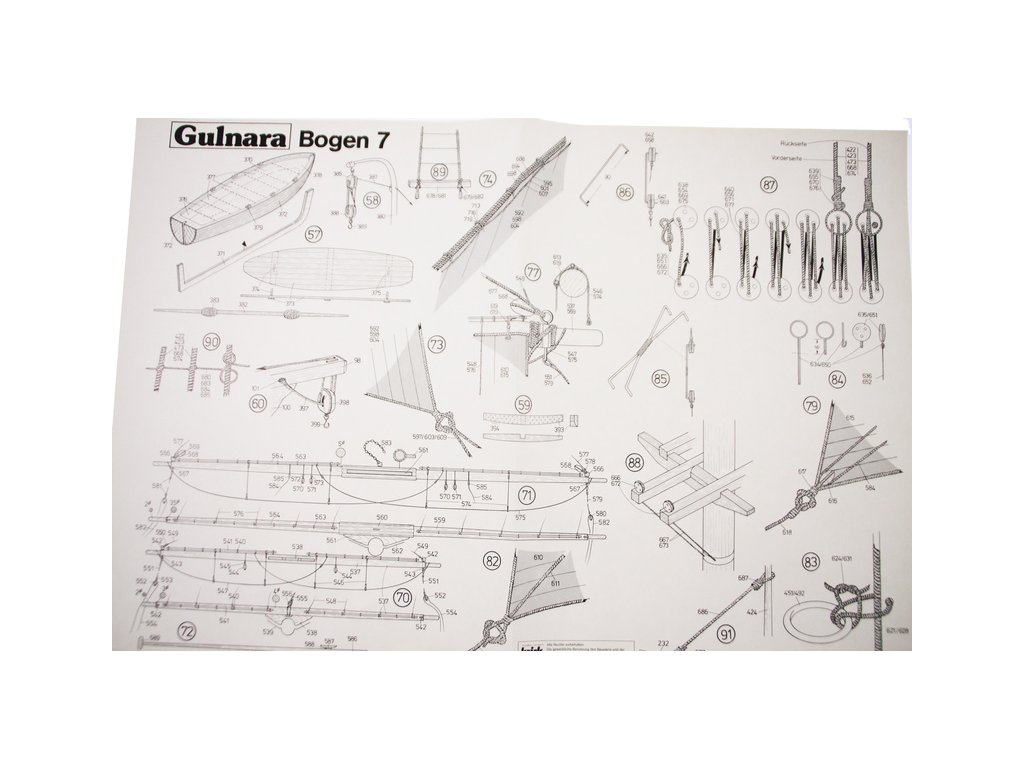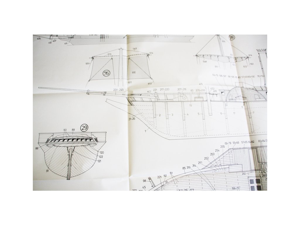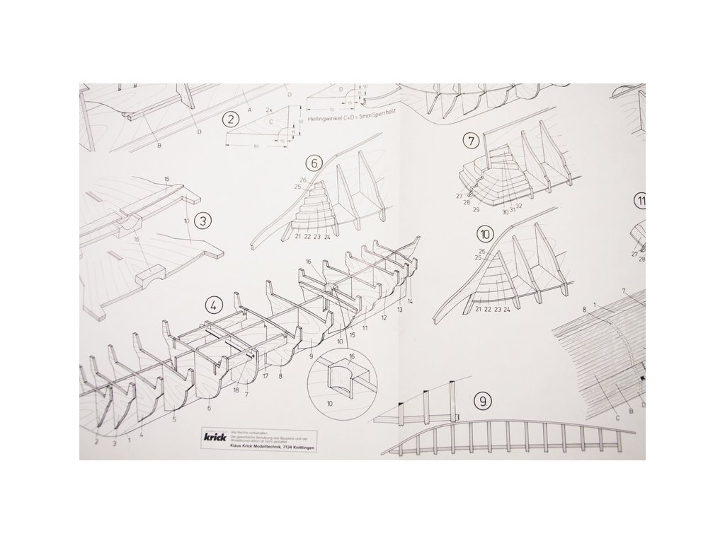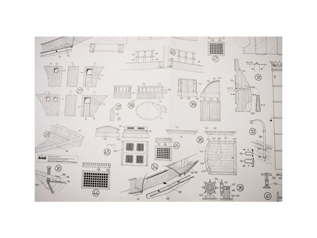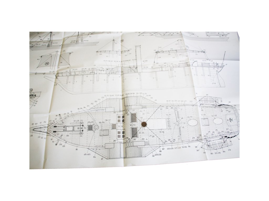 Set obsahuje kompletní sadu výkresové dokumentace modelu v měřítku 1:1 s obrázky jednotlivých detailů. Na výkrese jsou v měřítku nakresleny montážní sestavy, jejich kompletace a to včetně stěžňů a ráhen a způsob vázání lanoví. Vícejazyčný postup stavby rámcově upravuje logické sestavení jednotlivých komponentů.