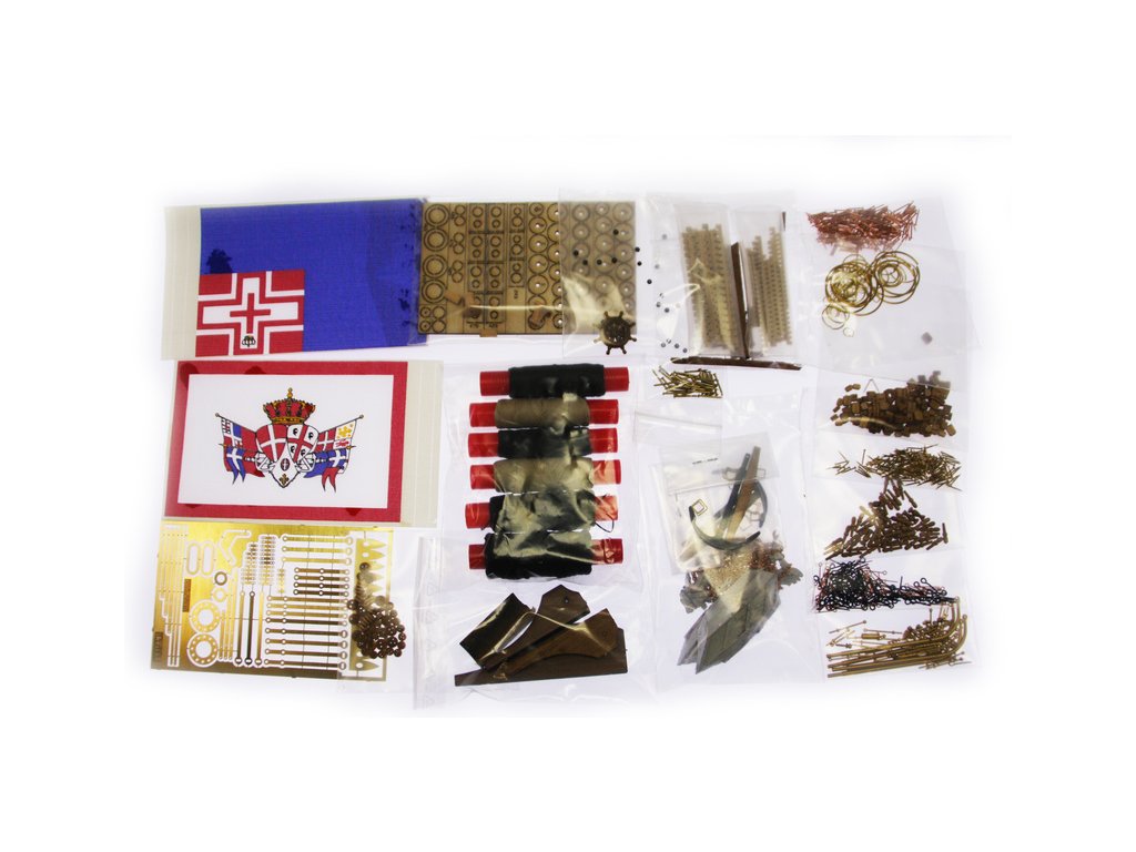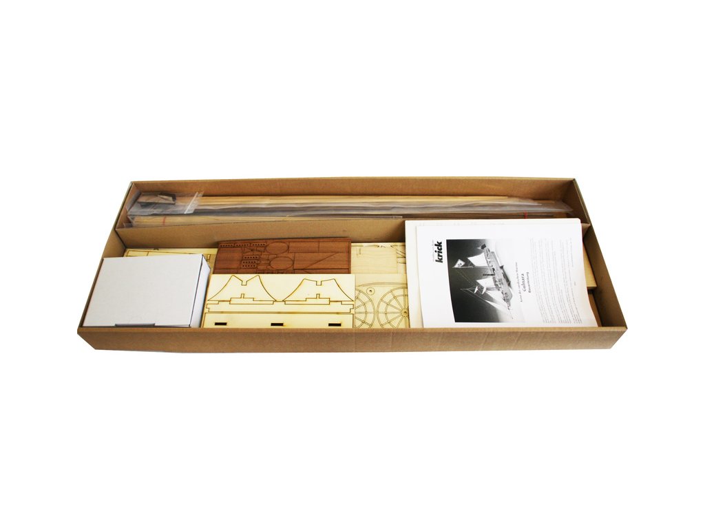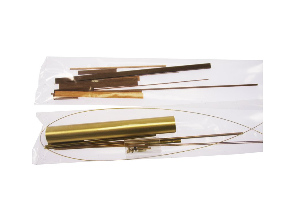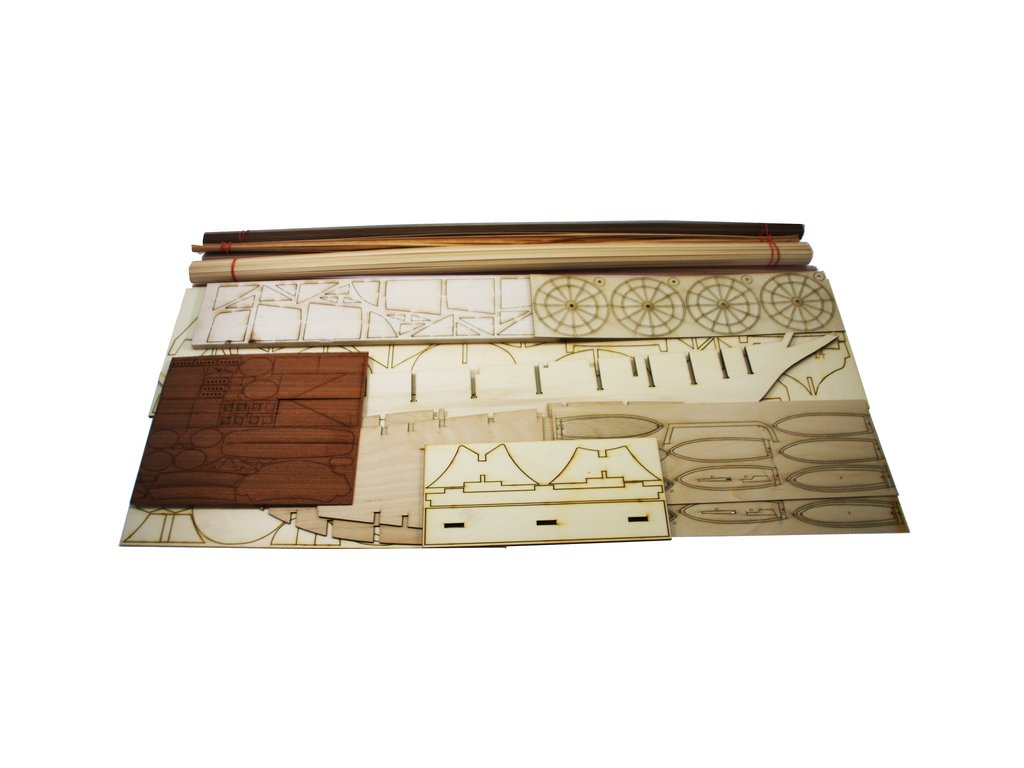Balení obsahuje sadu překližkových dílů, sadu dřevěných lišt o různém průřezu, sáčky s drobnými díly, díly z mosazi, sadu výkresů a vícejazyčný manuál.