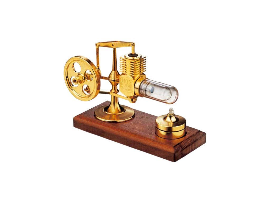 Stirlingův motor typu Beta, provedení Krick Motor Stirling zlatý smontovaný. Píst a ložisko výtlačného pístu jsou vyrobeny ze speciální, samomazného materiálu. To znamená, že žádnou údržbu a dlouhou životnost. Palivo je denaturovaný líh, dlouhá doba provozu. Vyroben z pozlacené mosazi. Délka celk. 155mm, šířka 60mm, výška 105mm.