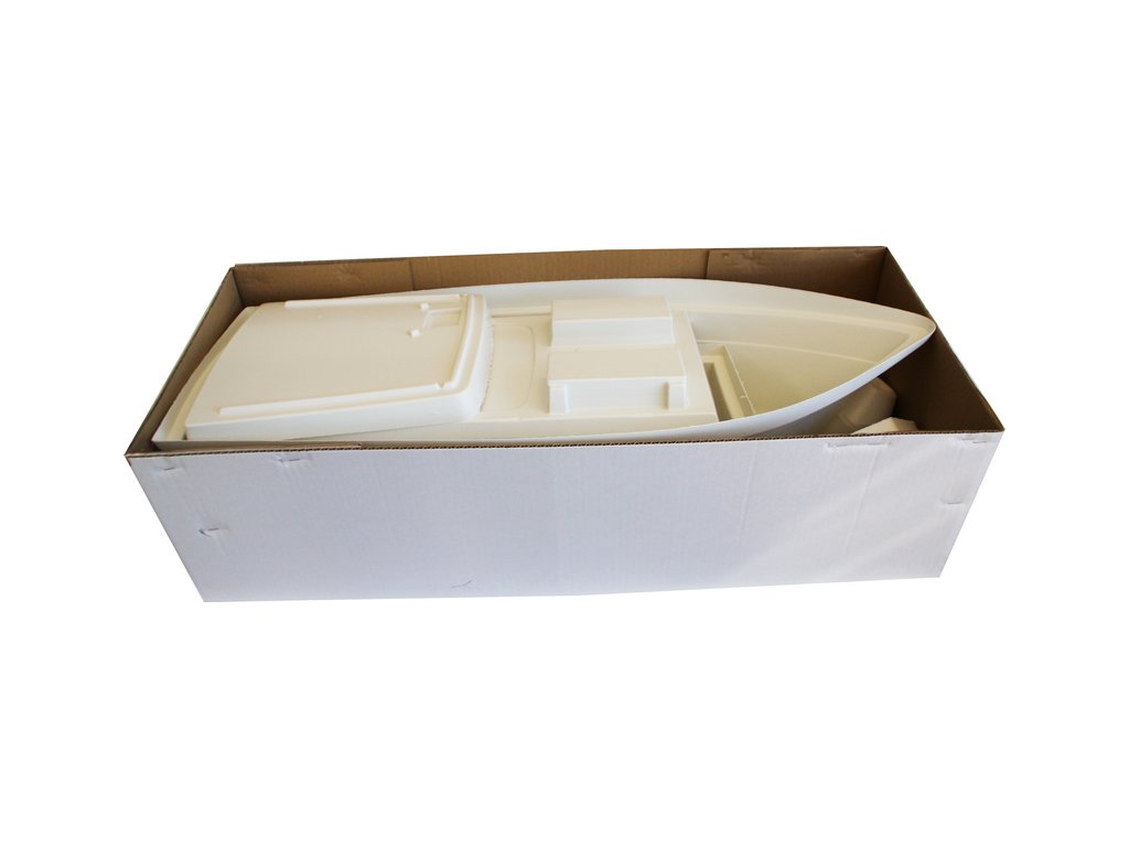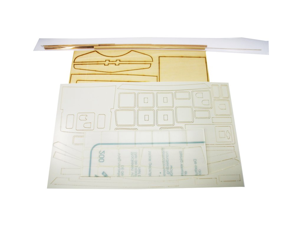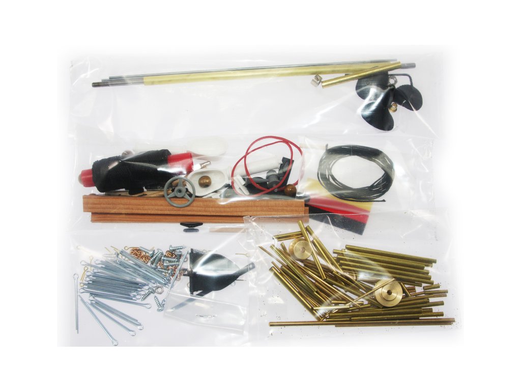 Obsahem balení jsou nenabarvené plastové výlisky, laserem vyřezané dřevěné a plastové díly, potřebný stavební materiál - mosazné trubičky, tyčky, táhla, hřídele, lodní šroub, ...). Manuál v angličtině a němčině, stavební výkresy 1:1. Stojánek není v balení.