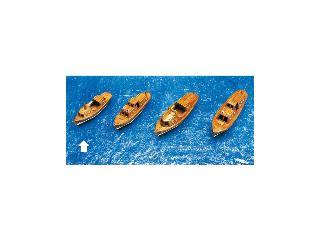 Stavebnice Krick: Motorový kajutový člun kit, rozměry 102x30x35mm. Jednoduchá stavebnice obsahuje přepážky vyřezané laserem z překližky, sadu lišt a stavební plány.