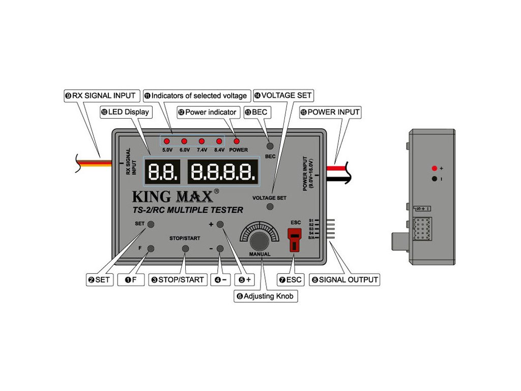 Krick Multitester TS-2/RC, je univerzální tester pro měření a nastavení Vašeho modelu. Funkce: měření rozsahu serva, sensitivity, měření rozsahu z vysílače, dlouhodobý test serva, vycentrování, rychlost serva, měření regulátoru, proudový odběr a další. Rozměry 127x78x34,6mm, hmotnost 163g.