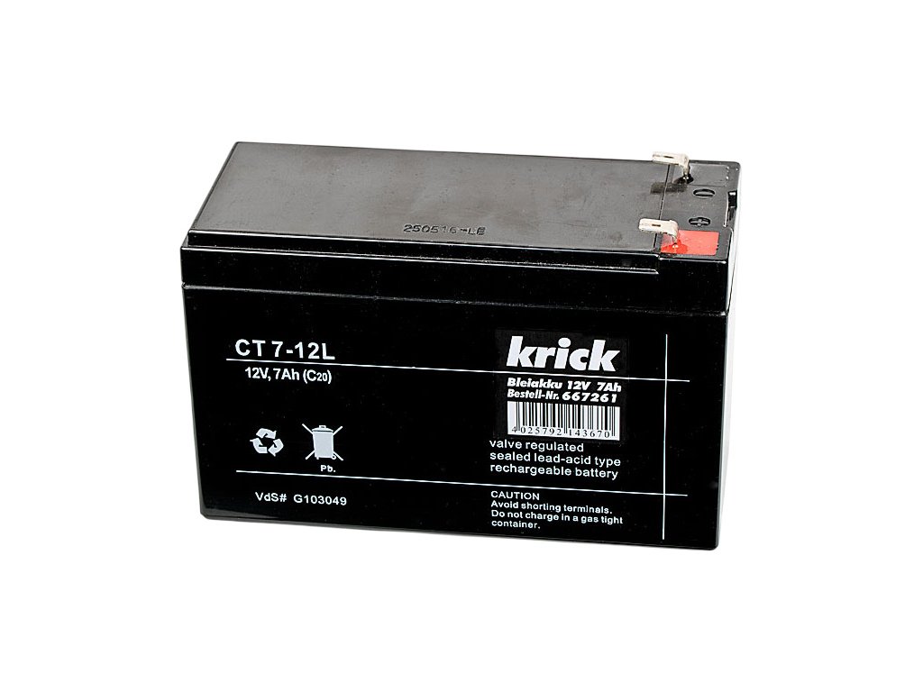Krick Olověný akumulátor, napětí 12V kapacita 7Ah, rozměry 65x100x161mm, hmotnost 2540g. Nabíjení 0,2C