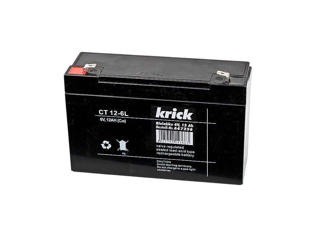 Krick Olověný akumulátor, napětí 6V kapacita 12Ah, rozměry 50x100x151mm, hmotnost 2000g. Nabíjení 0,2C