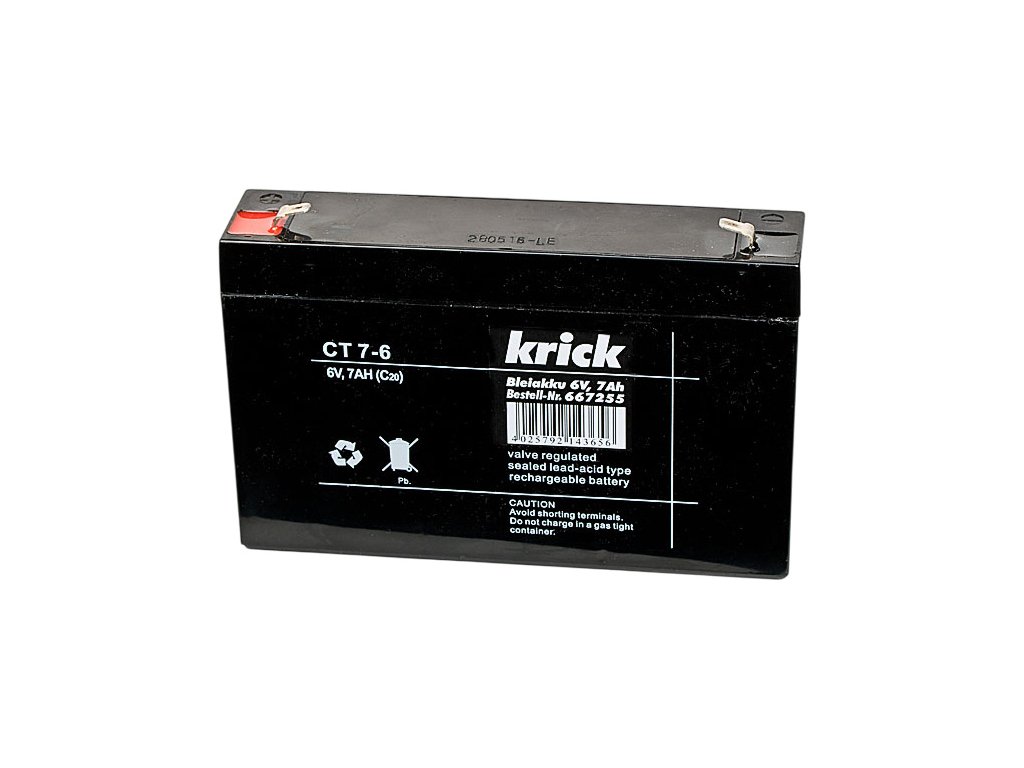 Krick Olověný akumulátor, napětí 6V kapacita 7Ah, rozměry 34x100x161mm, hmotnost 1280g. Nabíjení 0,2C