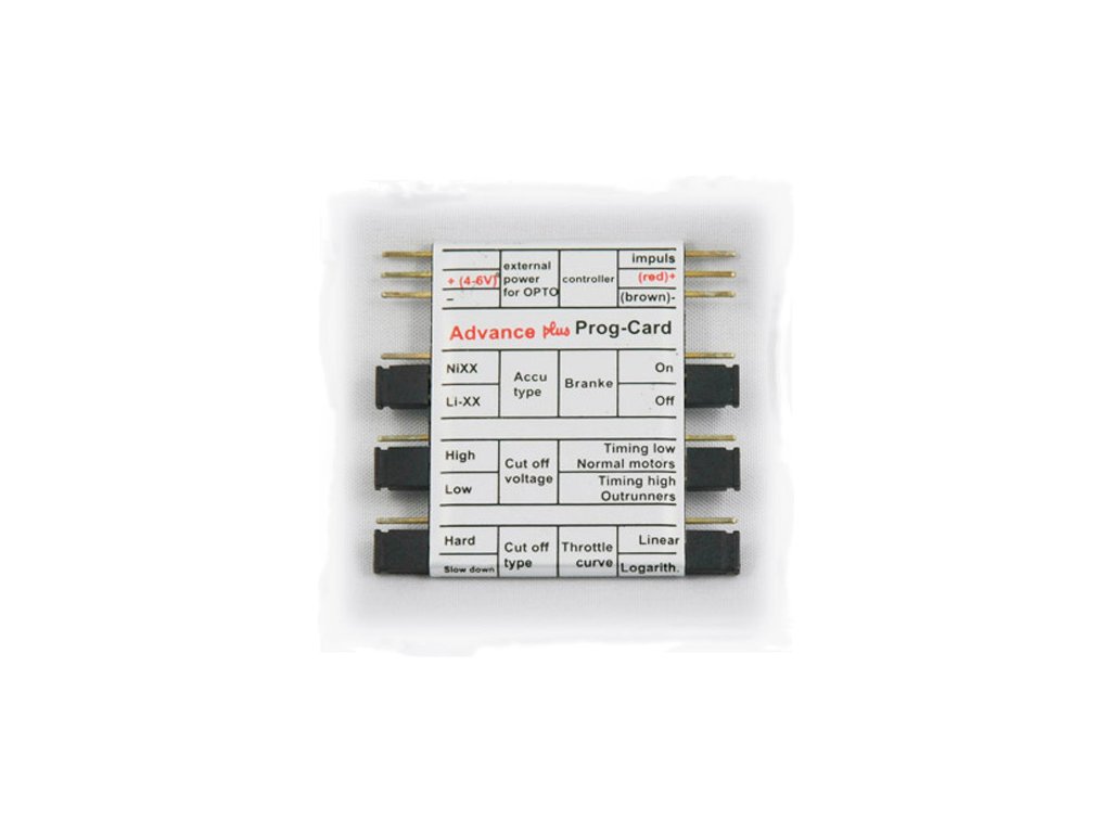 Programovací karta pro 67043 Střídavý regulátor Krick Pan 21, 60A. Regulátor lze rychle nakonfigurovat pomocí programovací karty, připojte regulátor pomocí servo kabelu, připojte ovladač k baterii a pomocí zásuvných propojek vyberte nastavení.