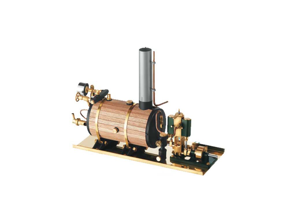 Parní stroj obsahuje několik komponentů, které pomohou vašemu modelu plout efektivně, výkonně a šetrně k okolí. Pístový motor se připojí pomocí kardanové spojky s hřídelí pro lodní šroub. Jedná se o oscilační dvouválcový motor, který lze regulovat pro chod vpřed, vzad a pro zastavení, regulovat lze rovněž velikost otáček v obou směrech. Řízení regulace a chodu motoru se provádí pomocí páky na motoru, ke které se připojí servo řízení.