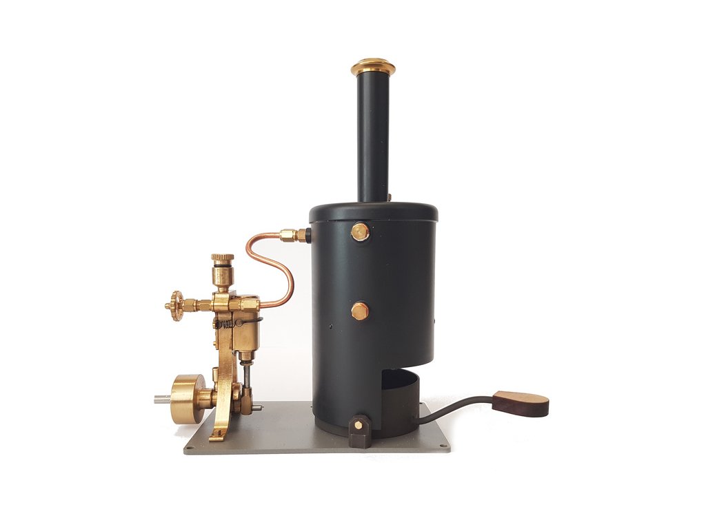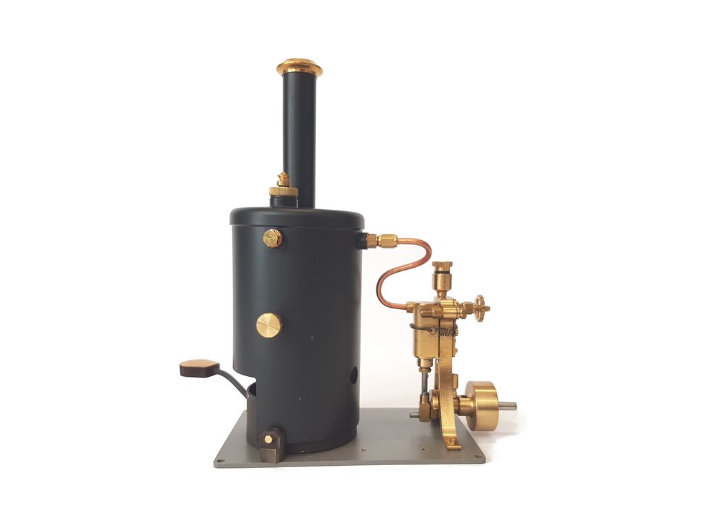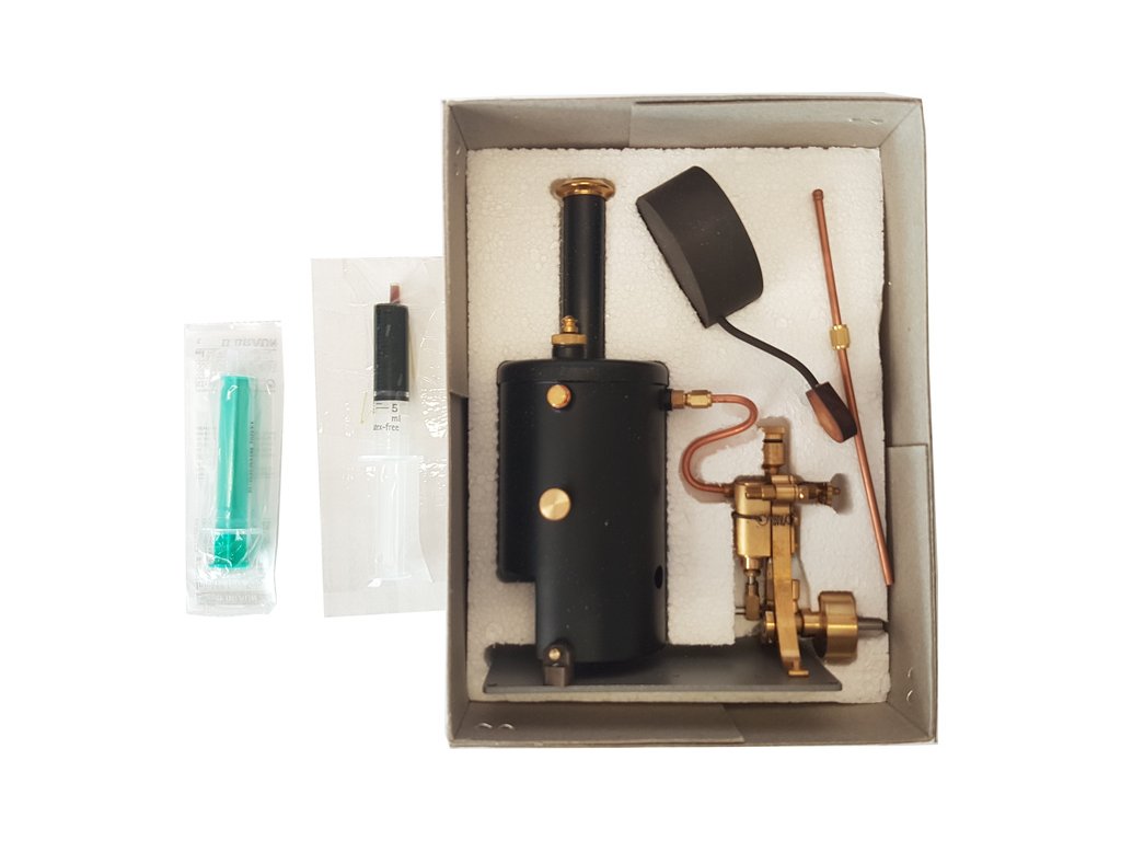 Jednoduchý maketový parní stroj pro autentický pohon modelů lodí. Parní kotel na tuhý líh pohání jedno-válcový parní stroj. Regulace množství páry je možná pomocí ručního ventilu.