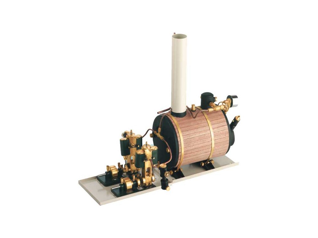 Parní stroj obsahuje několik komponentů, které pomohou vašemu modelu plout efektivně, výkonně a šetrně k okolí. Pístový motor se připojí pomocí kardanové spojky s hřídelí pro lodní šroub. Jedná se o dva oscilační dvouválcové motory, které lze regulovat pro chod vpřed, vzad a pro zastavení, regulovat lze rovněž velikost otáček v obou směrech. Řízení regulace a chodu motoru se provádí pomocí páky na motoru, ke které se připojí servo řízení.