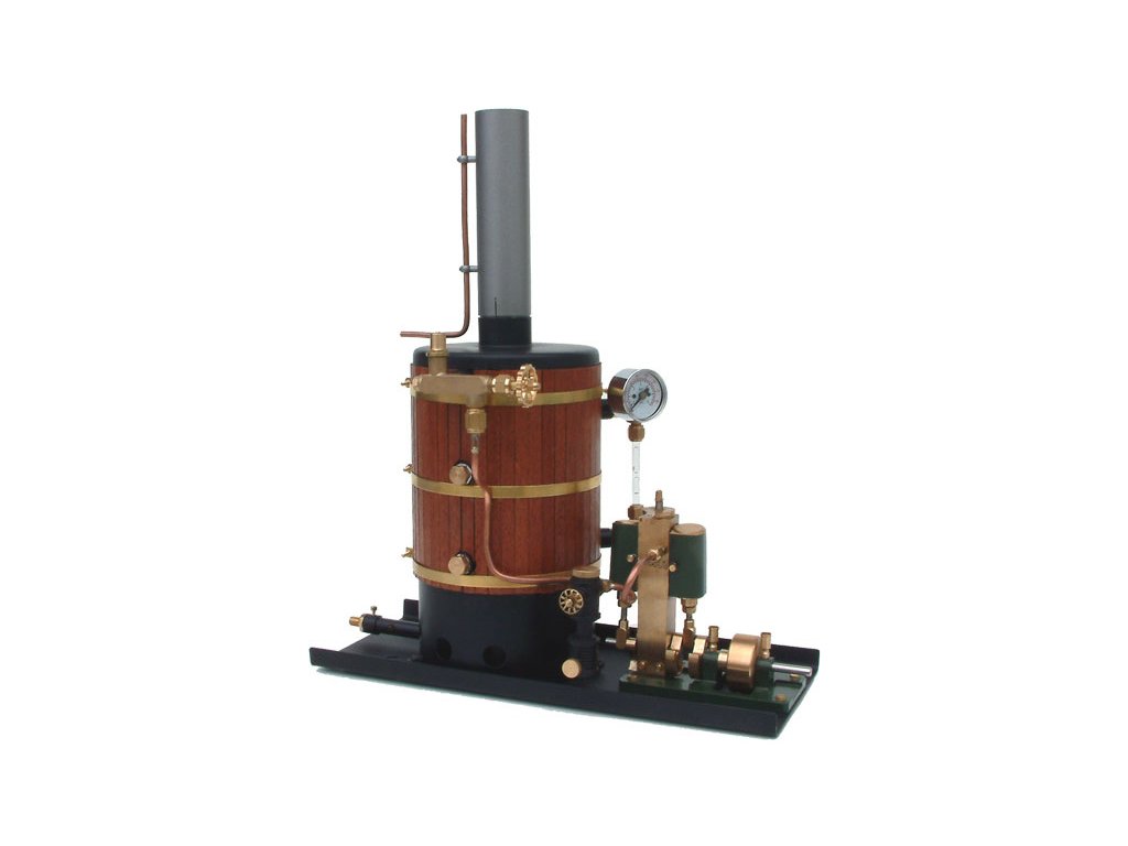 Parní stroj obsahuje několik komponentů, které pomohou vašemu modelu plout efektivně, výkonně a šetrně k okolí. Pístový motor se připojí pomocí kardanové spojky s hřídelí pro lodní šroub. Jedná se o oscilační dvouválcový motor, který lze regulovat pro chod vpřed, vzad a pro zastavení, regulovat lze rovněž velikost otáček v obou směrech. Řízení regulace a chodu motoru se provádí pomocí páky na motoru, ke které se připojí servo řízení.