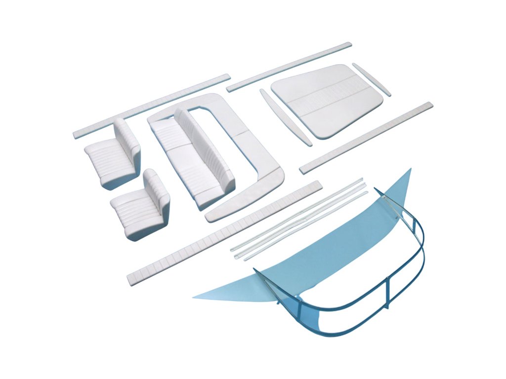 Krick Polstrování, větrný štítek pro model lodi Riva Krick. Obsahuje PVC sedadla a čalounění, nelakovaná. Dále čelní sklo a rám vyleštěný z nerezové oceli.