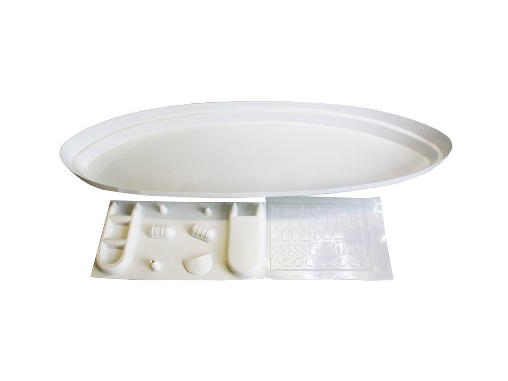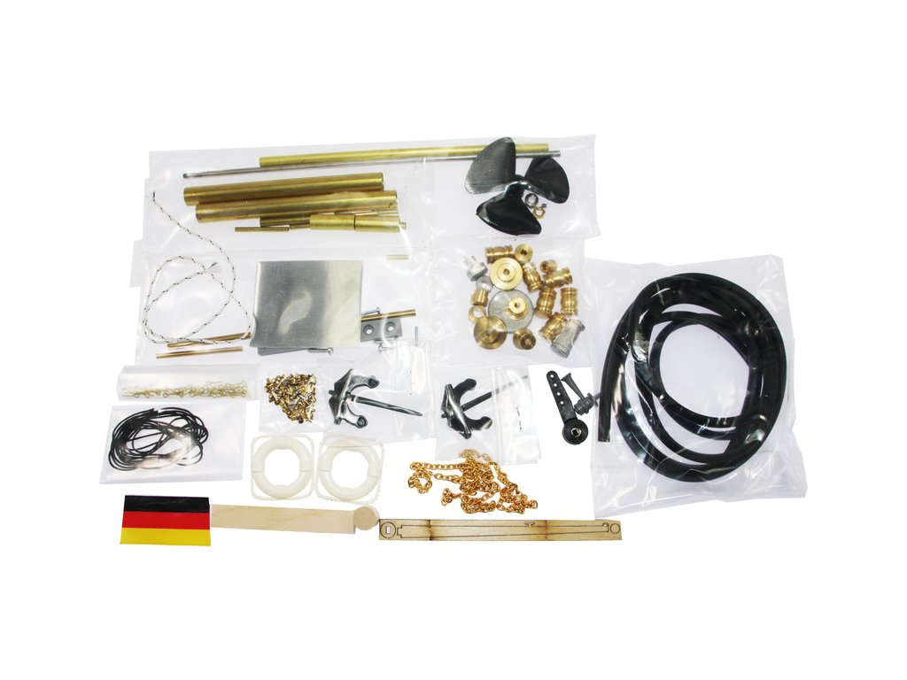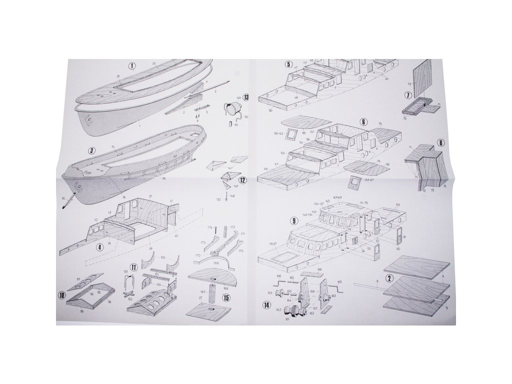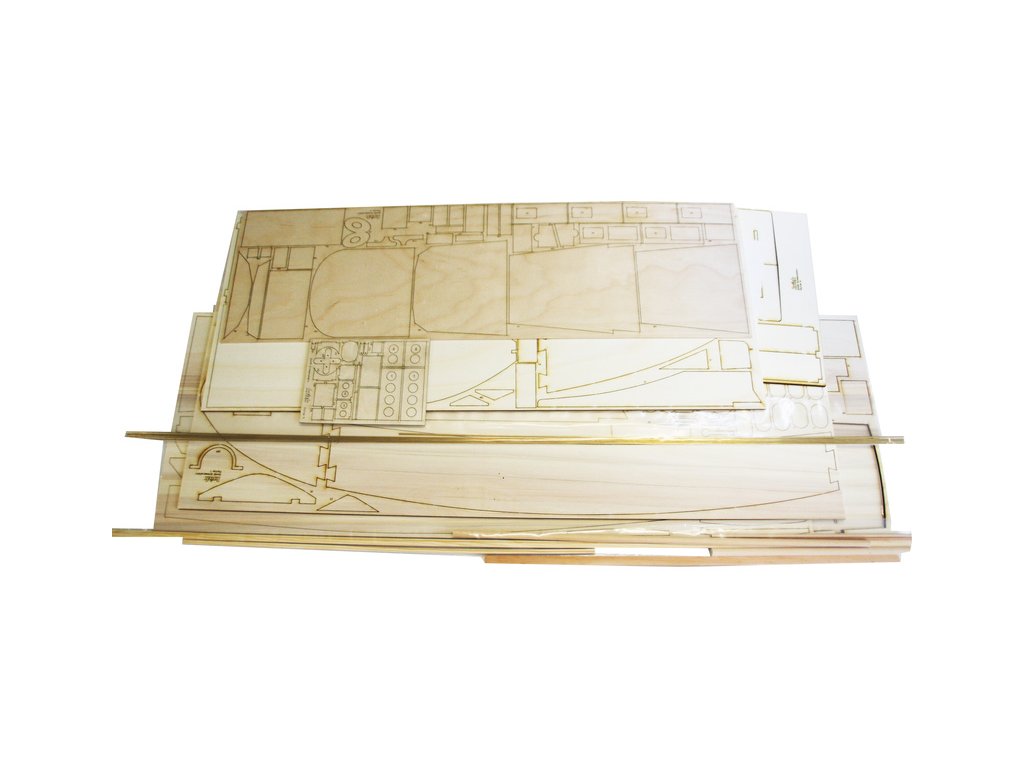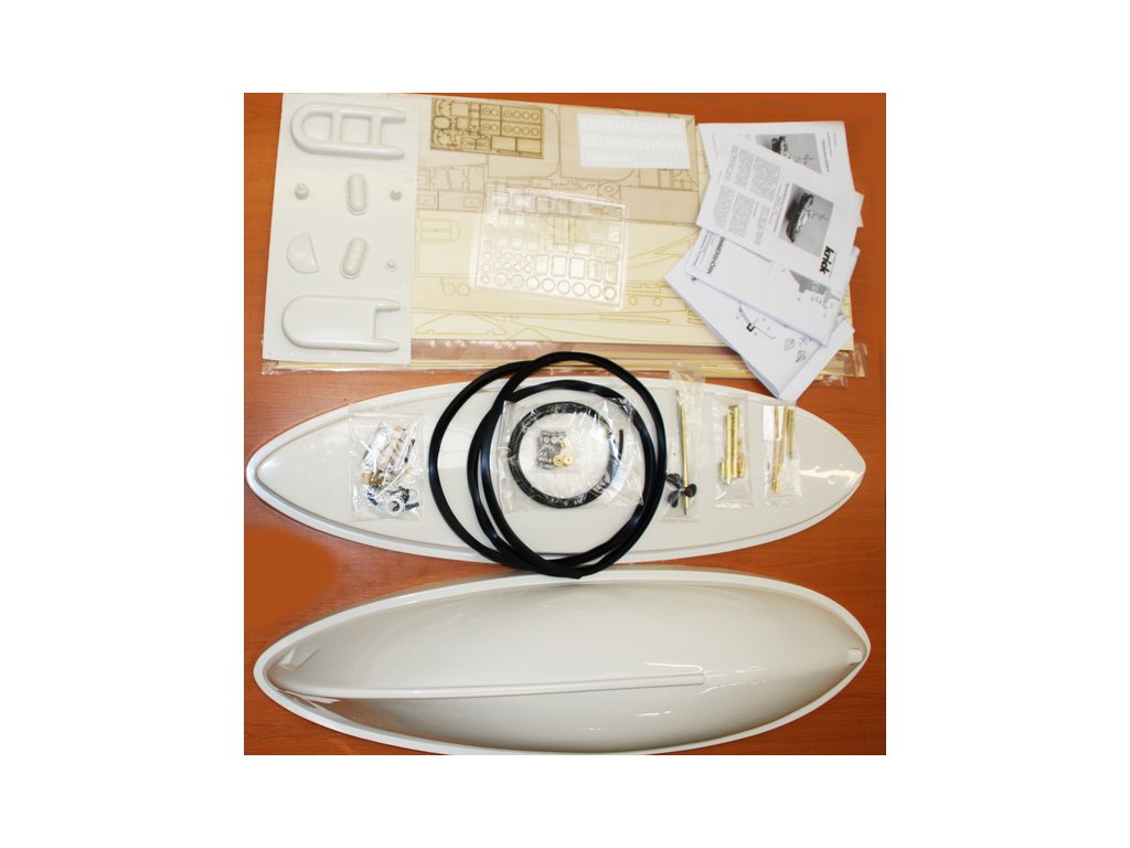 Výlisky trupu z ABS, sada laserem řezaných překližkových dílů, lodní šroub s hřídelí, táhla, páka řízení, plastové maketové doplňky, čirý plast na zasklení kabiny, montážní příslušenství, pokyny pro provoz, manuál EN.