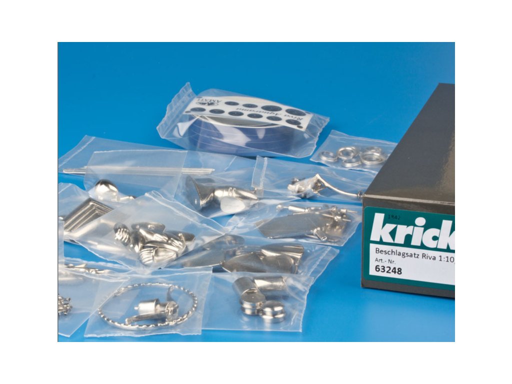 Krick sada kovových maketových doplňků pro lodě modelu Riva 1:10. Kovové pochromované díly, modré polepy. Vhodné pro klasické sportovní lodě Riva a také pro modely Chris Craft.