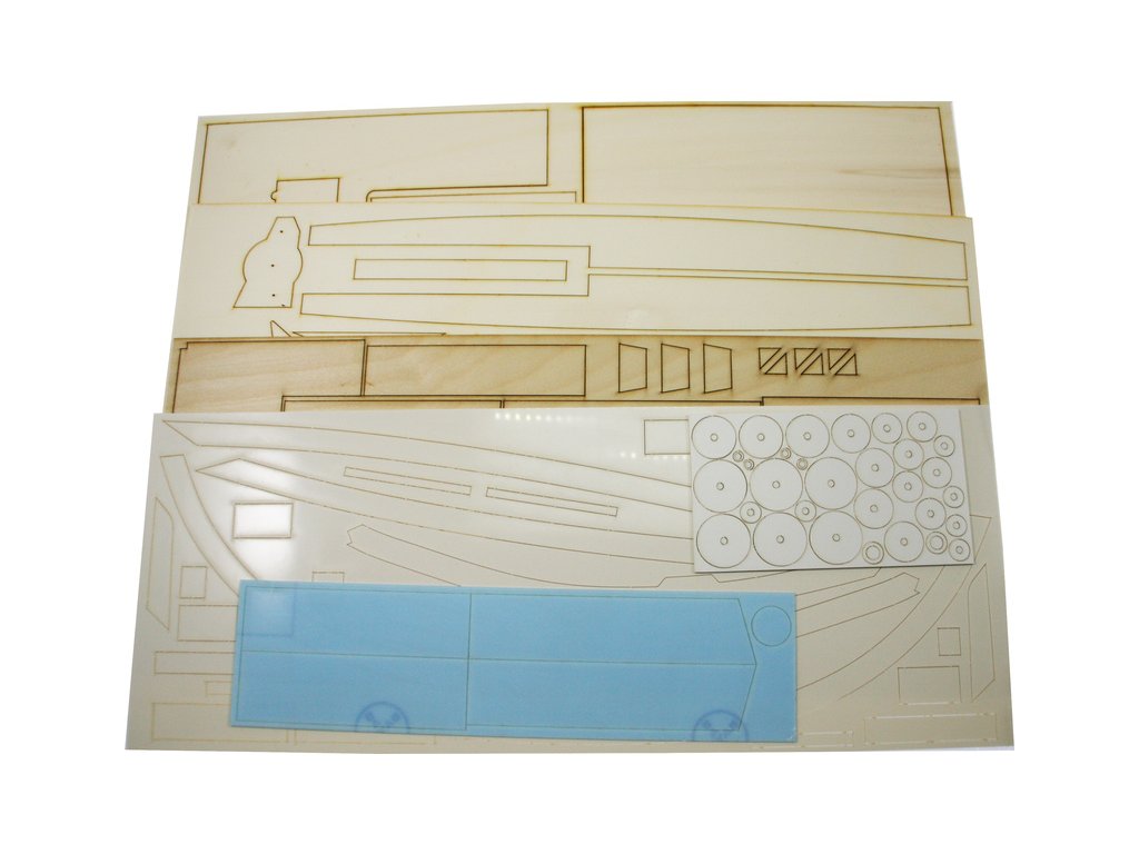 Balení obsahuje sadu plastových výlisků ABS trupu, paluby a nástaveb, sadu překližkových dílů, sáčky s drobnými díly, díly z mosazi, lodní šroub s hřídelí, sadu výkresů a vícejazyčný manuál.