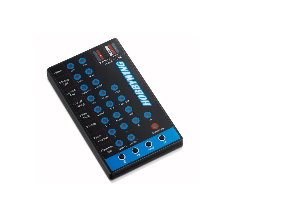 Programovací karta pro letecké regulátory Hobbywing FLYFUN a Skywalker slouží ke snadnému a rychlému programování regulátorů - doma "na stole" stejně jako na letišti. Regulátor se připojuje pomocí servokabelu, zásuvka se nachází na horní straně karty. Napájení karty je zajištěno z BEC stabilizátoru napájení regulátoru Hobbywing nebo z běžného 4-5čl. NiCd nebo NiMH přijímačového akumulátoru připojeného ke kartě (v případě regulátoru OPTO). Programování se provádí s připojeným motorem i pohonným akumulátorem (i v případě OPTO regulátorů).