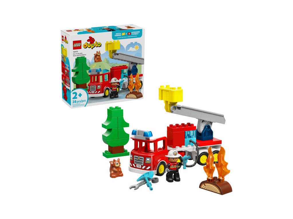 - HRAČKA LEGO® DUPLO® S HASIČEM – Tato hračka pro hraní na hrdiny umožňuje batolatům vžít se do role hasiče, který hasí hořící poleno pomocí hadice, zatímco z povzdálí situaci sleduje zvědavá veverka