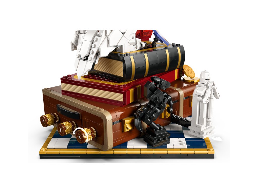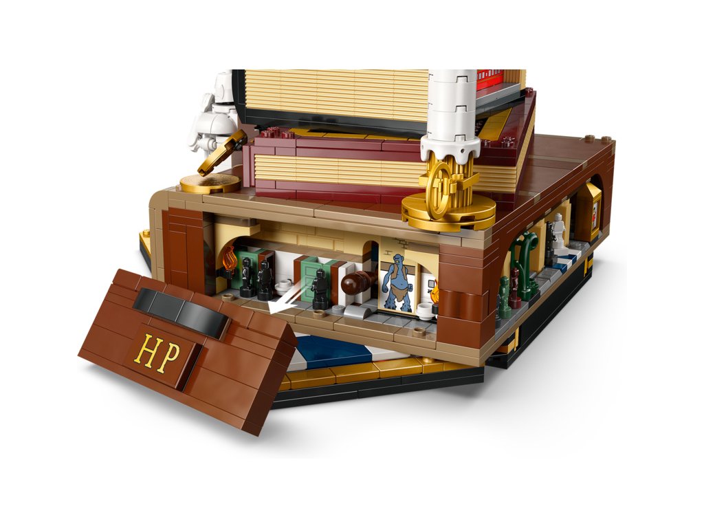 - ZÁBAVNÉ FUNKCE – Otočením 3 koleček odejměte boční část kufru Harryho Pottera a odhalte filmovou scénu v mikroměřítku, otočte Hedvičinu hlavu nebo přesuňte královnu na kouzelnické šachovnici