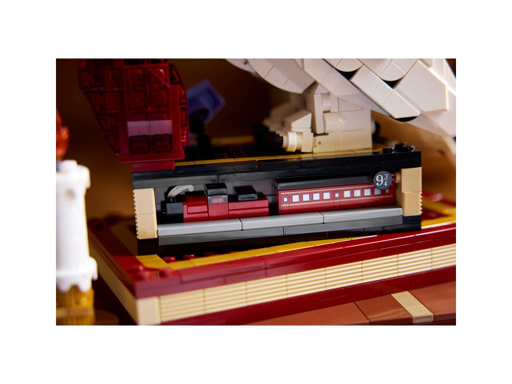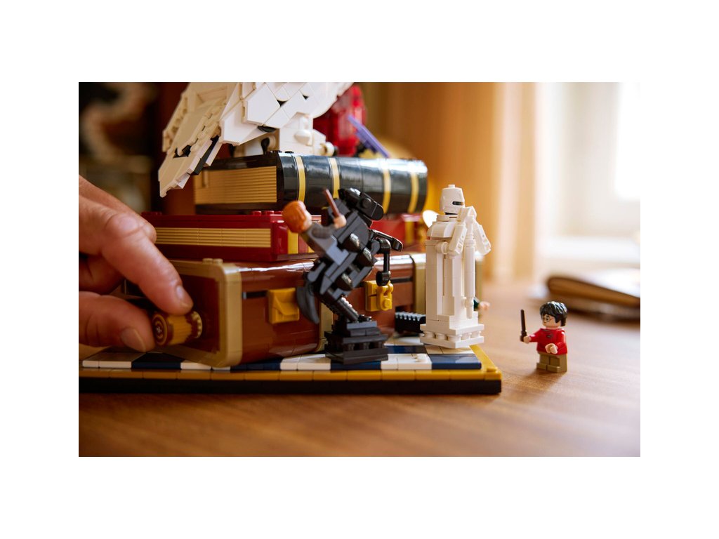 Otočte třemi kolečky a otočte hlavou Hedviky, přesuňte královnu na kouzelnických šachách a odejměte boční část Harryho kufru, která ukrývá scénu s útokem horského trolla v koupelně. Další mikromodely zahrnují Bradavický expres a pět zkoušek, které musí Harry podstoupit, aby se dostal ke Kameni mudrců. Stavebnice obsahuje 1 571 dílků.