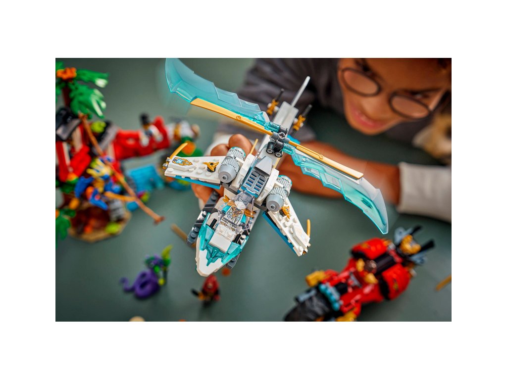 - 2 VOZIDLA NINDŽŮ – Motorka nindžů má pohyblivá kola, sedlový kokpit pro minifigurku a 2 vystřelovače, a helikoptéra má otevírací kokpit a otočné vrtule