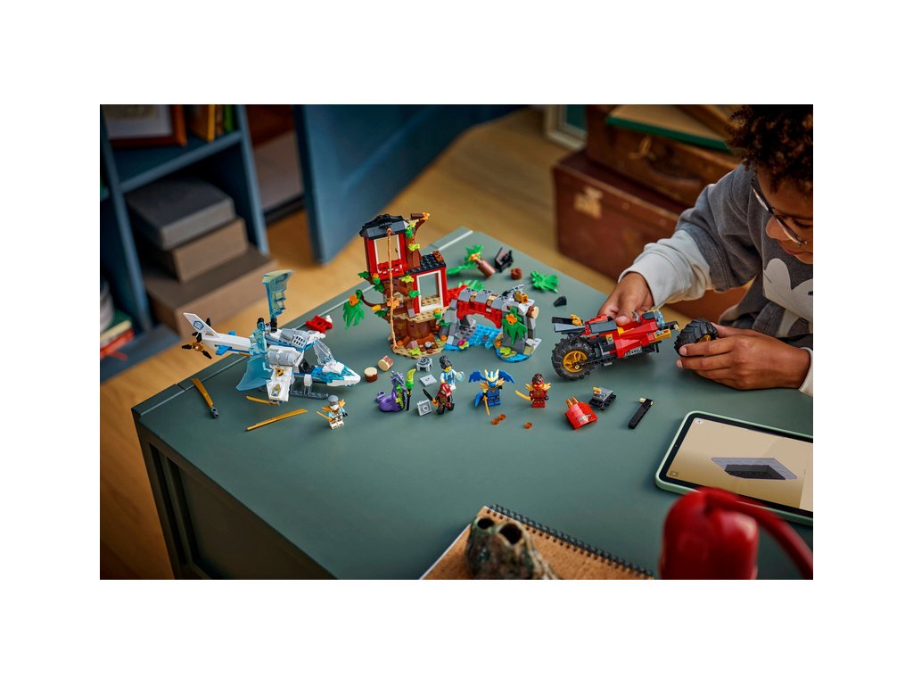 - BOJOVÁ HRAČKA PRO DĚTI – Se stavebnicí Souboj nindža vozidel a domek na stromě (71857) si kluci a holky od 7 let připomenou bojové scény z 4. řady televizního seriálu NINJAGO® Dračí povstání