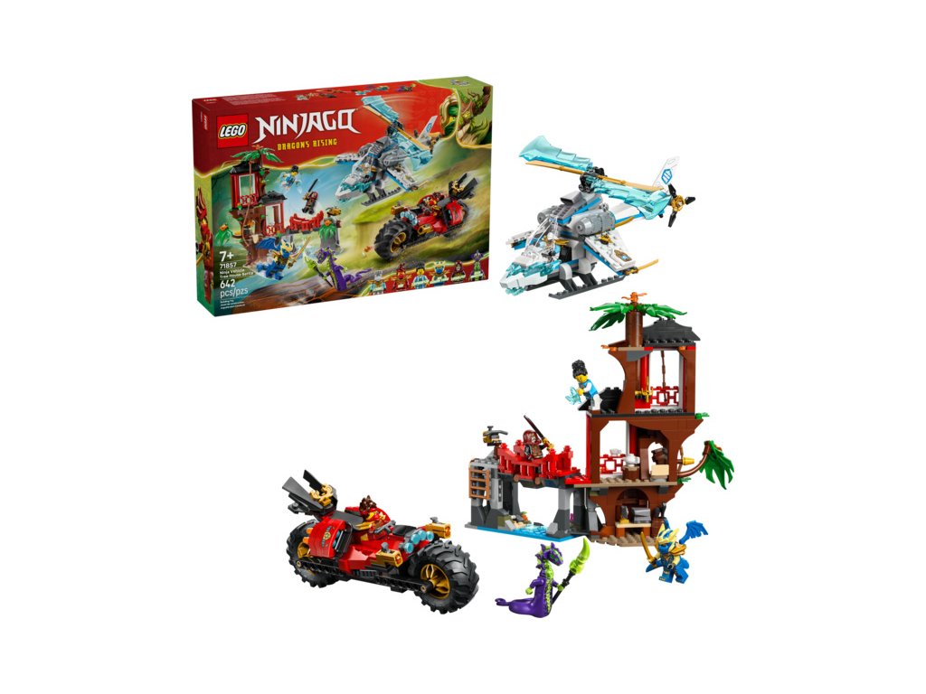 Stavebnice Souboj nindža vozidel a domek na stromě (71857) inspirovaná 4. řadou seriálu NINJAGO® Dračí povstání přináší vše, co děti od 7 let potřebují k přehrávání akčních bitev. Tato bojová stavebnice obsahuje třípatrový domek na stromě, helikoptéru, motorku a 6 minifigurek. Hračka v podobě domku na stromě obsahuje dílnu, čajovnu, terasu, houpací lano z liány, past, která uvolňuje malý kámen, otočný most a vystřelovač.